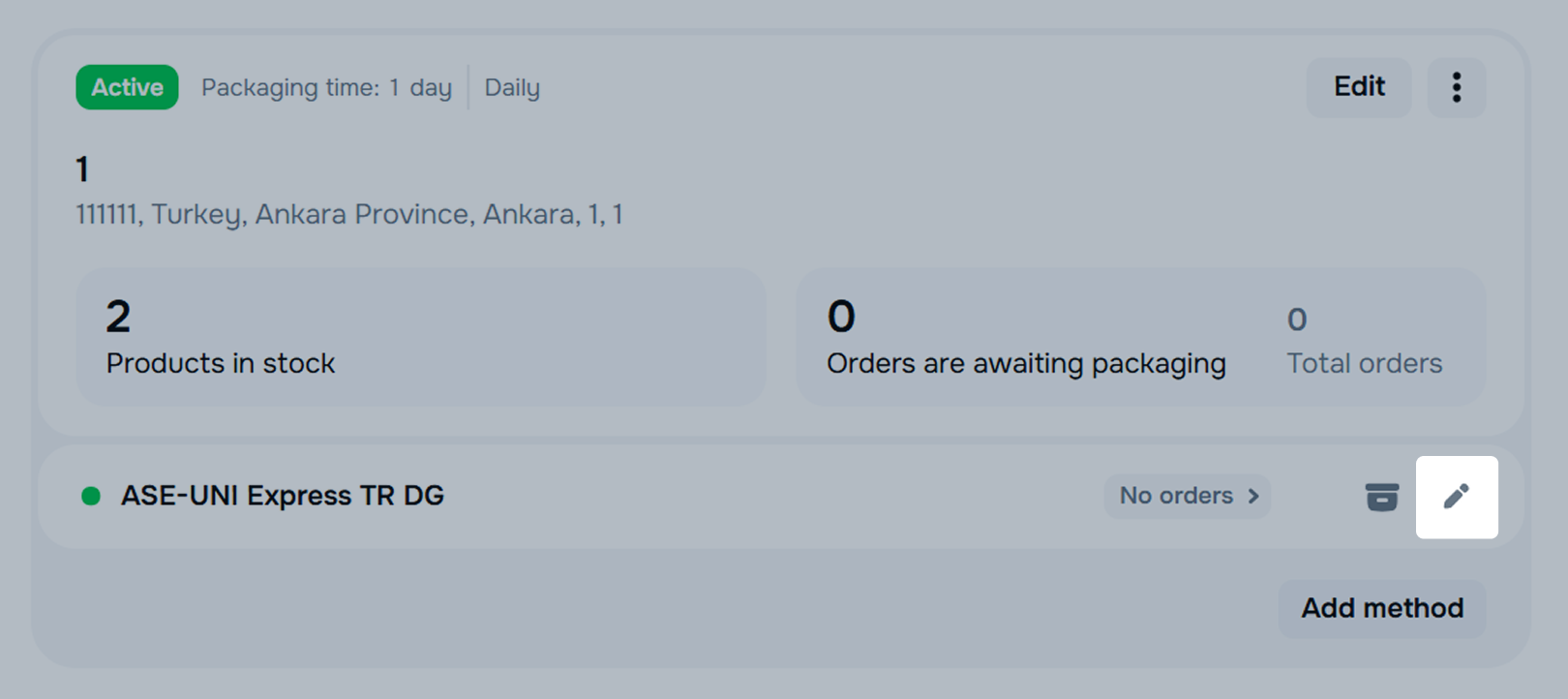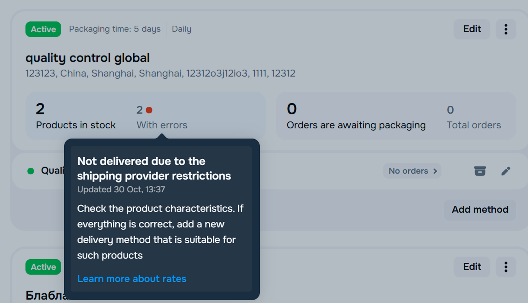 Make sure that you’ve specified the location for handing over the products to the shipping provider correctly. If you violate the handover deadline, the quality metrics will decrease, and we’ll limit your sales on the platform.