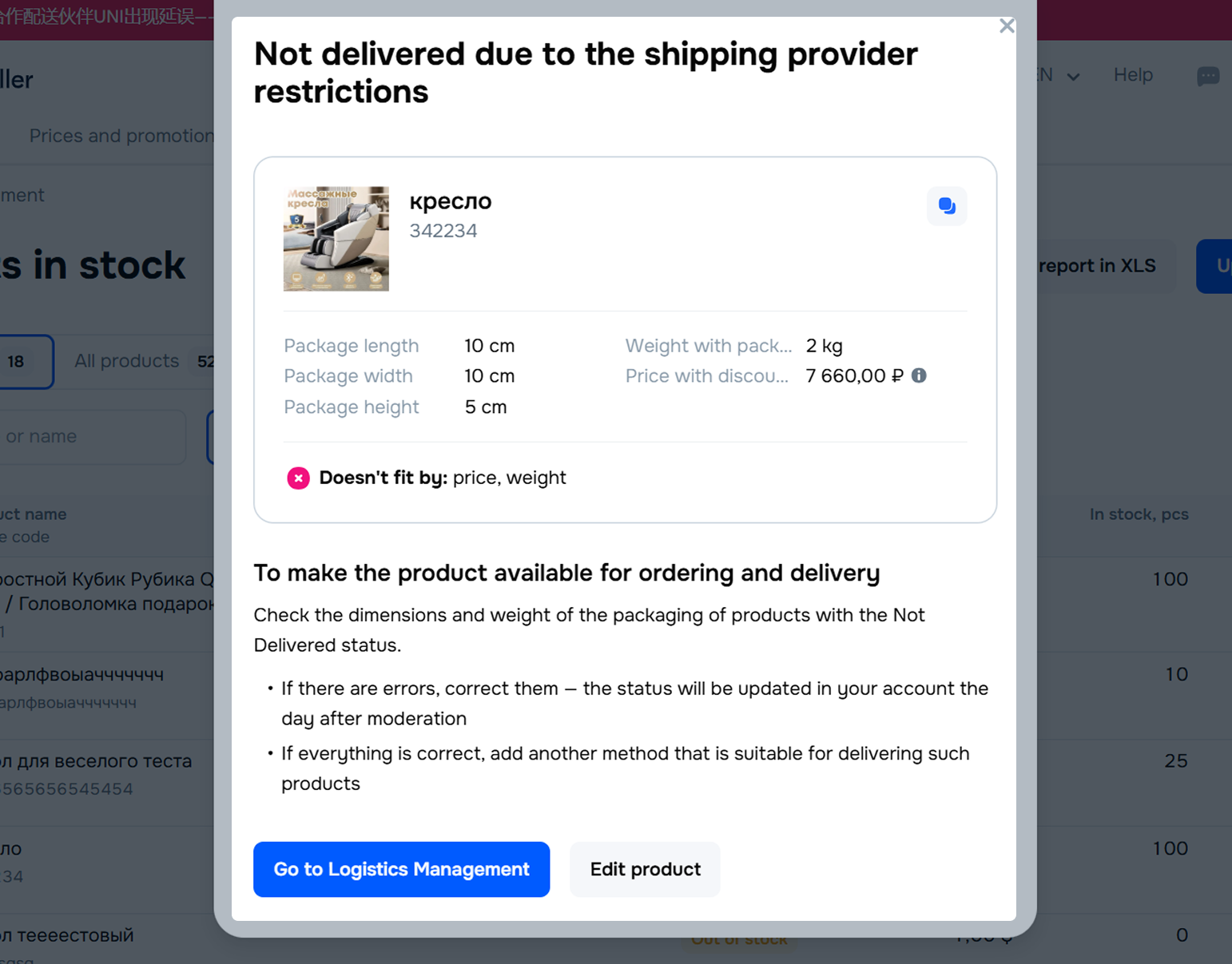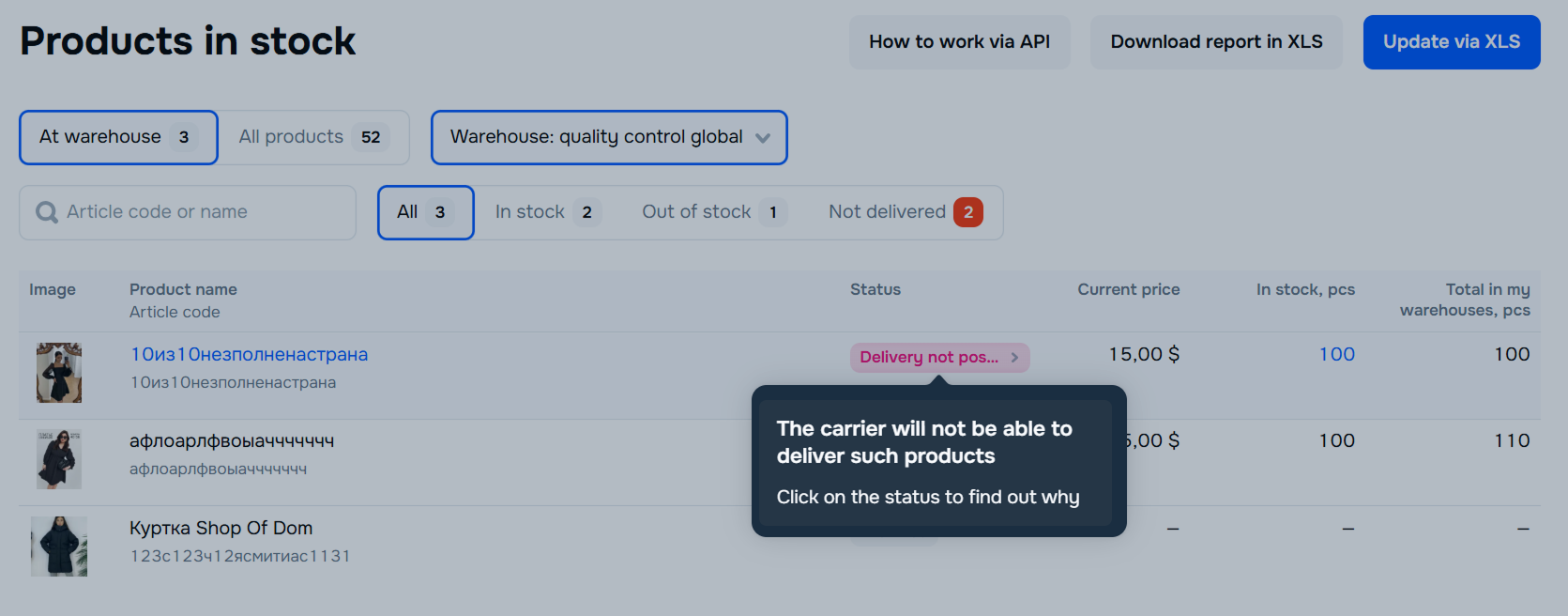 The filter is displayed in the Logistics → Logistics management section. It helps to identify warehouses with problematic products. This allows you to timely adjust delivery methods or warehouse settings, helping to avoid situations when products are unavailable for order.