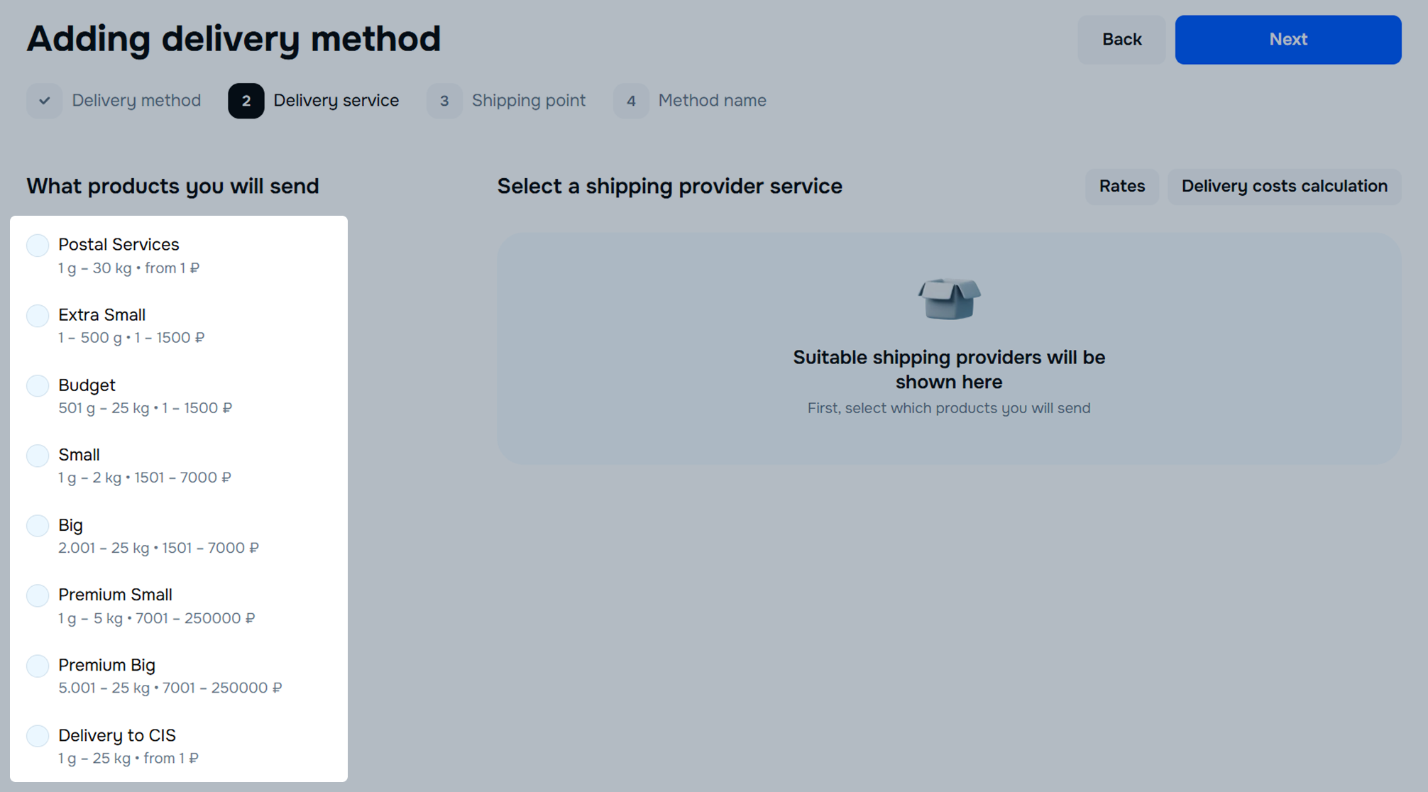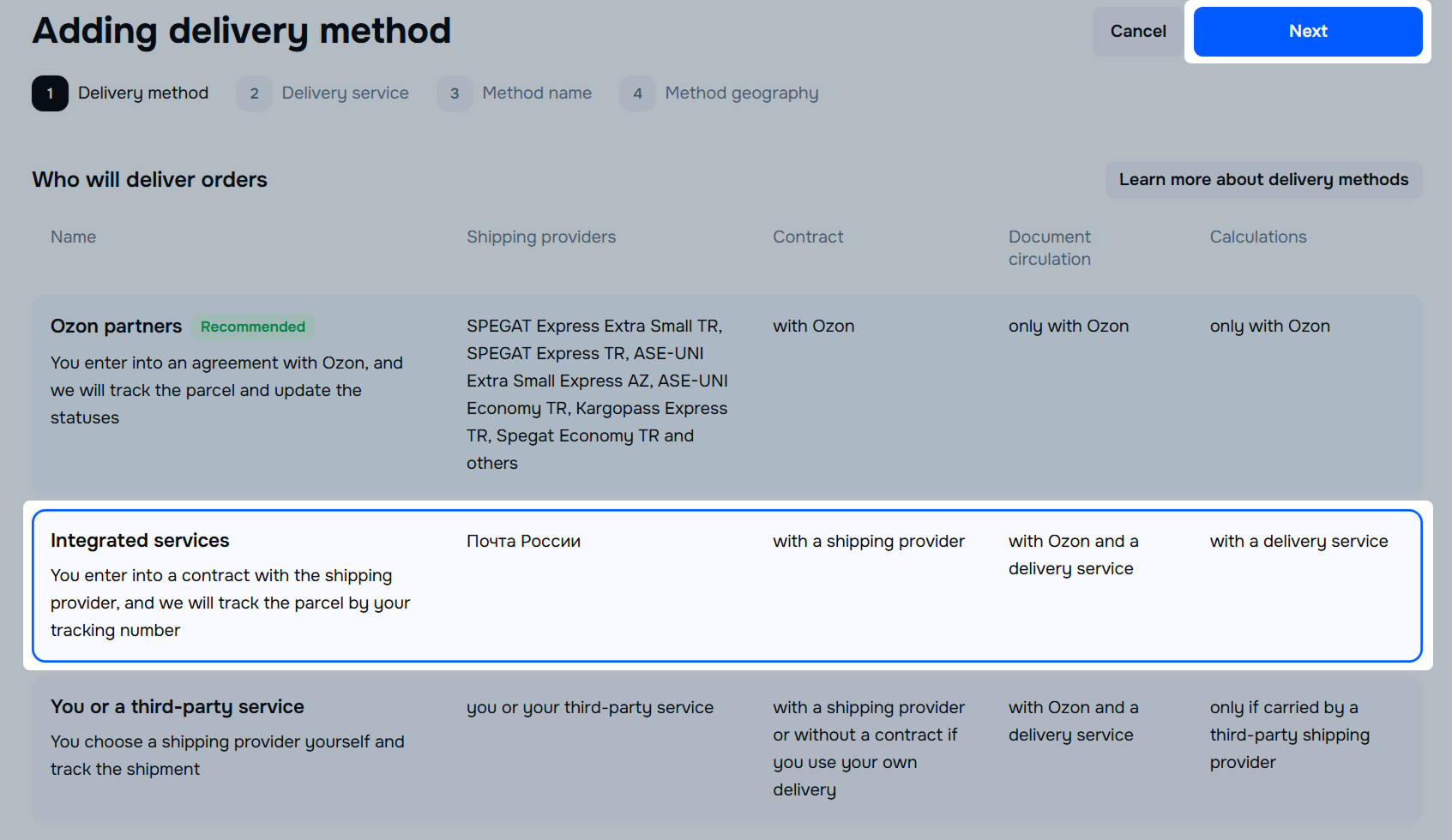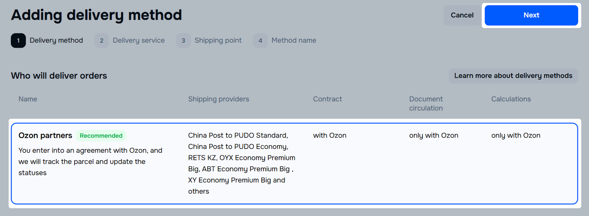Select Ozon partners and click Next. The available delivery methods are suggested based on your warehouse address.