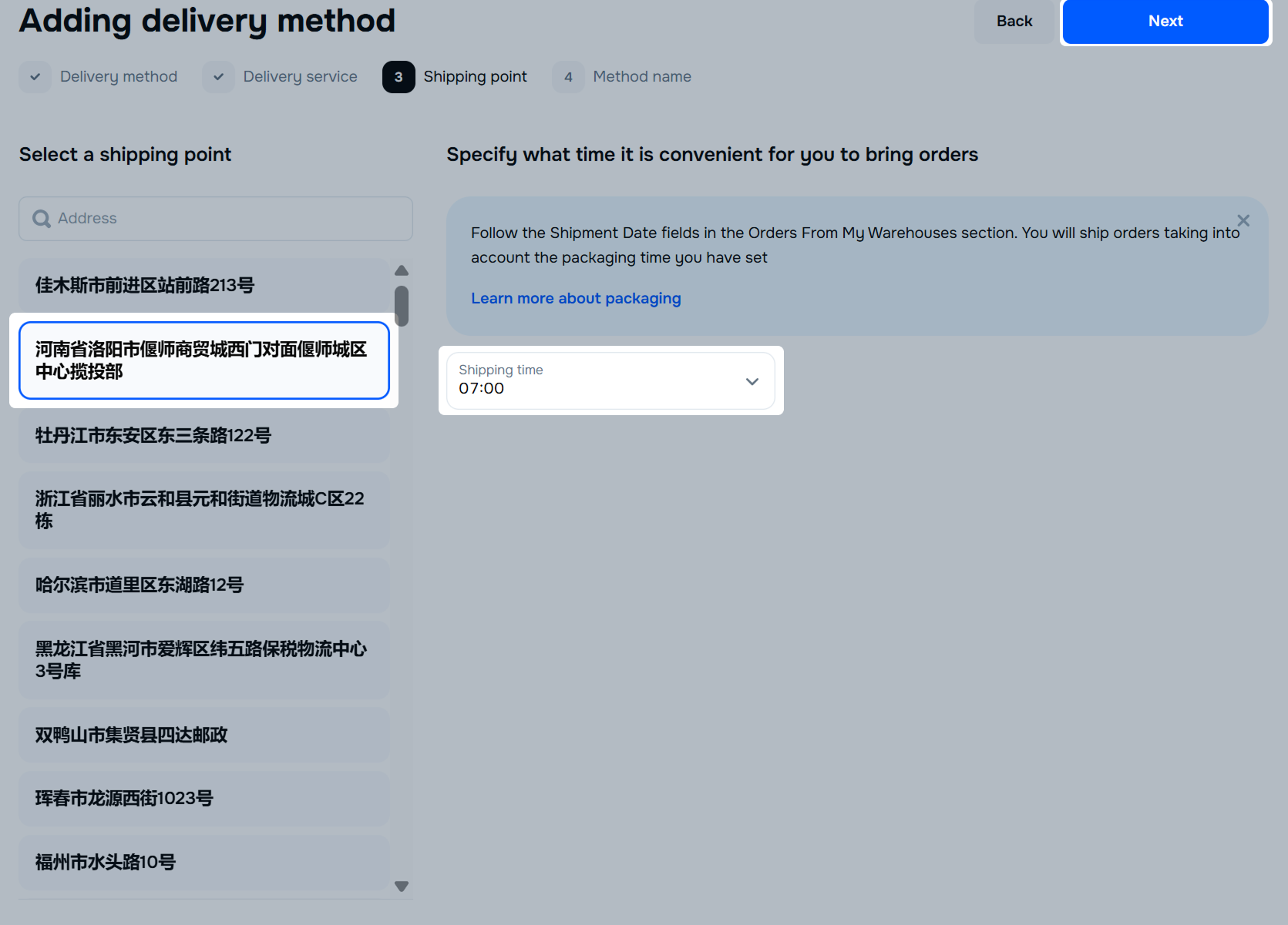 Select the drop-off point and specify what time is convenient for you to bring your orders. Click Next.