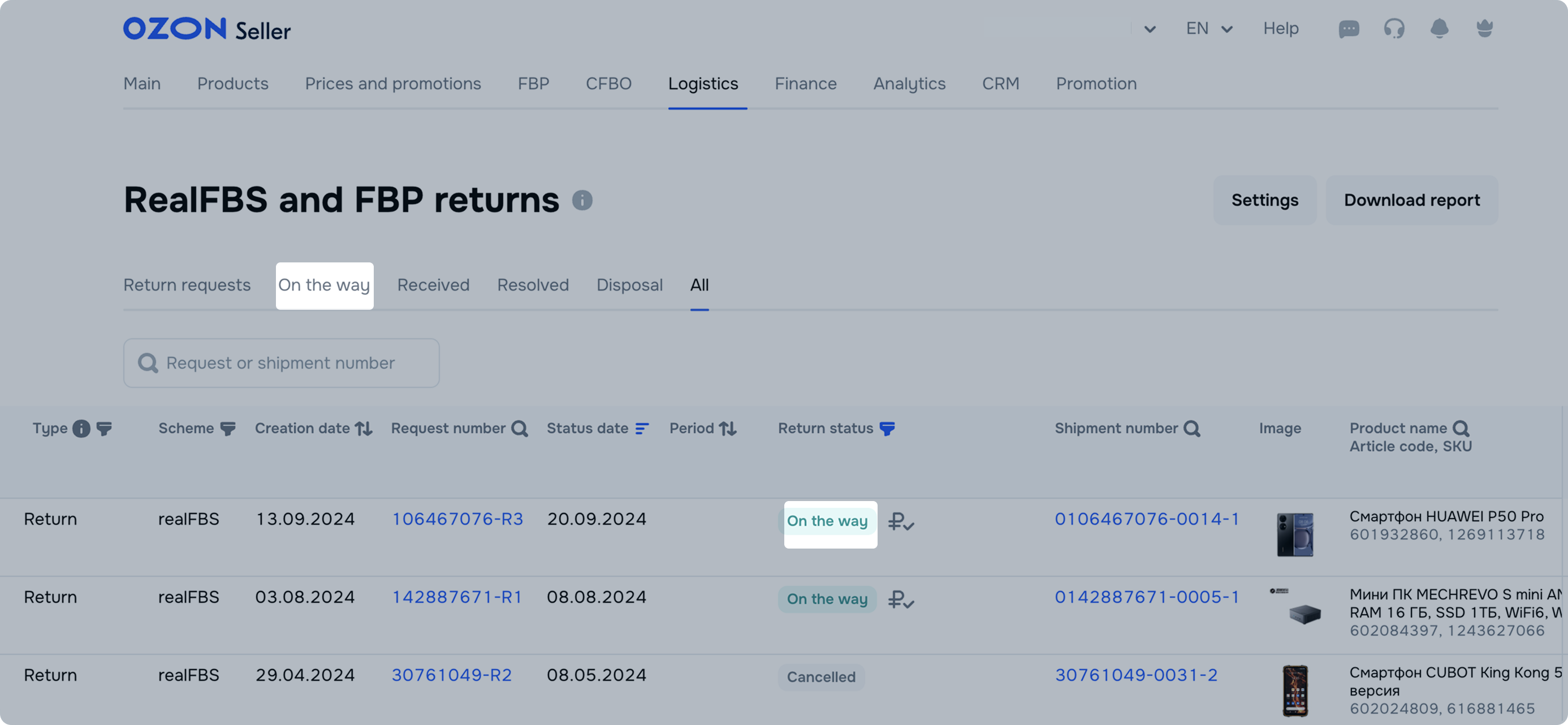 On the On the road tab: for returns accepted at Ozon pick-up points and sent to partner’s warehouses.
