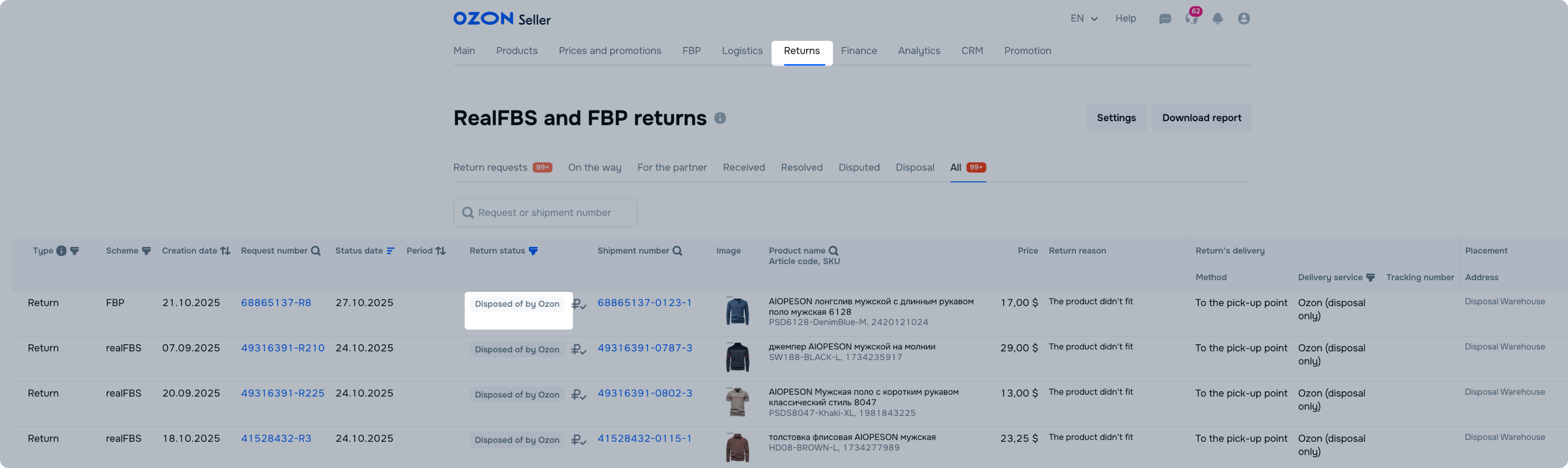 You can view which products are disposed of in the Logistics → RealFBS and FBP returns section. The “Ozon (disposal only)” method is shown in the Delivery service column.