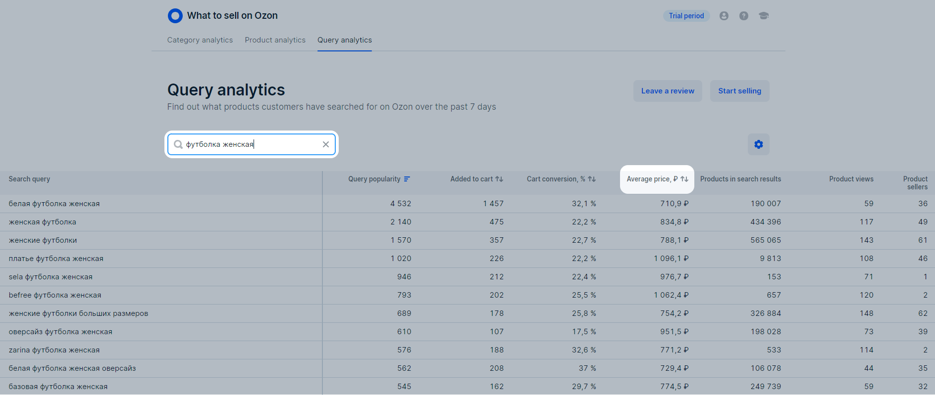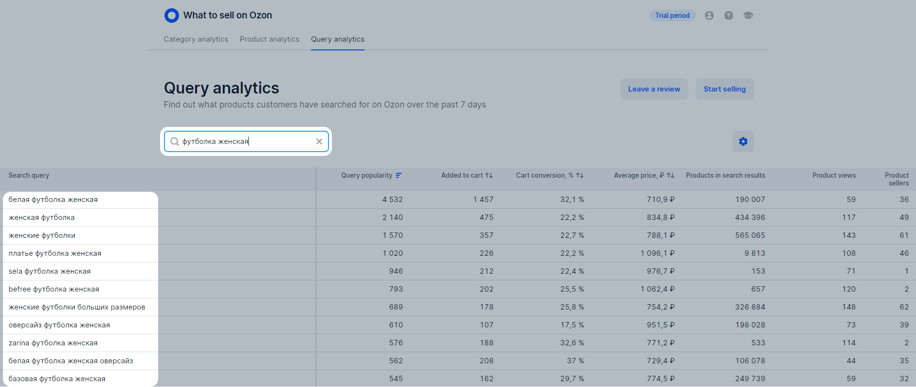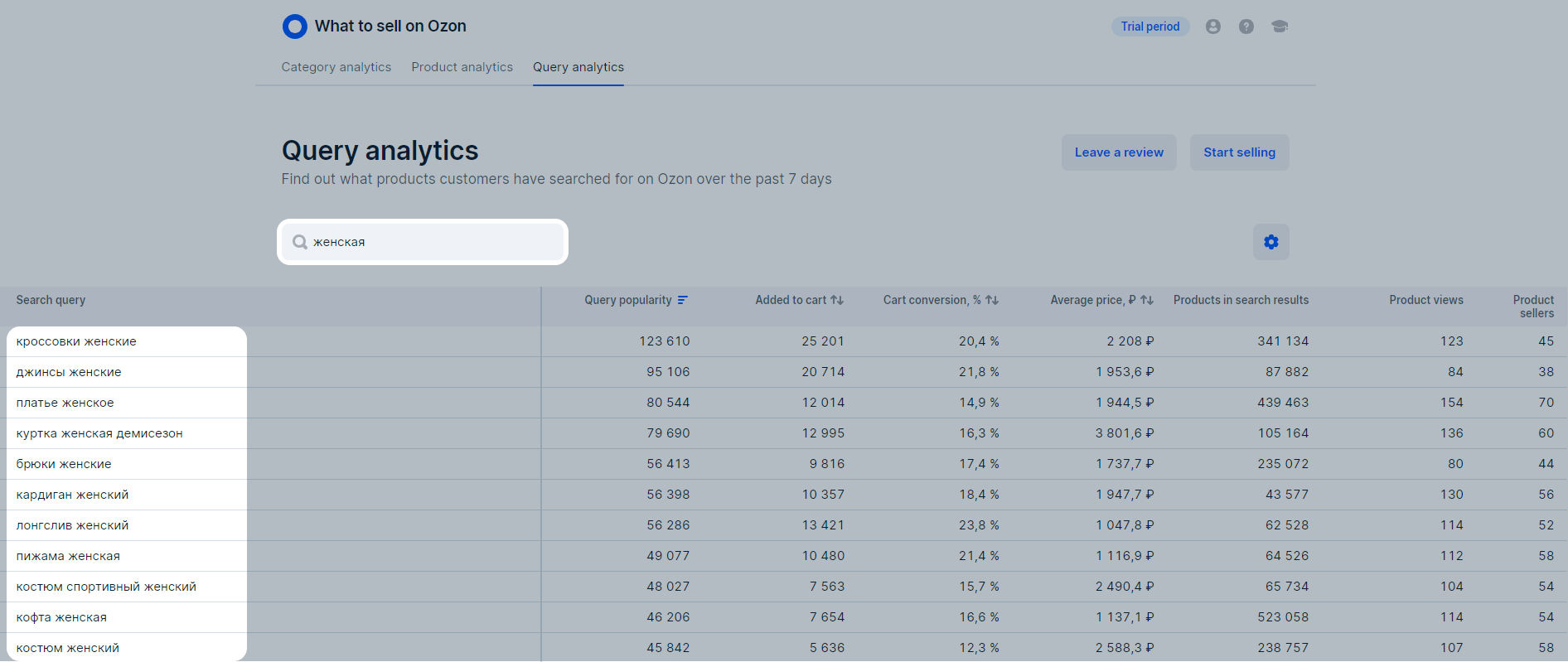 In the What to sell on Ozon → Query analytics section, you can view: