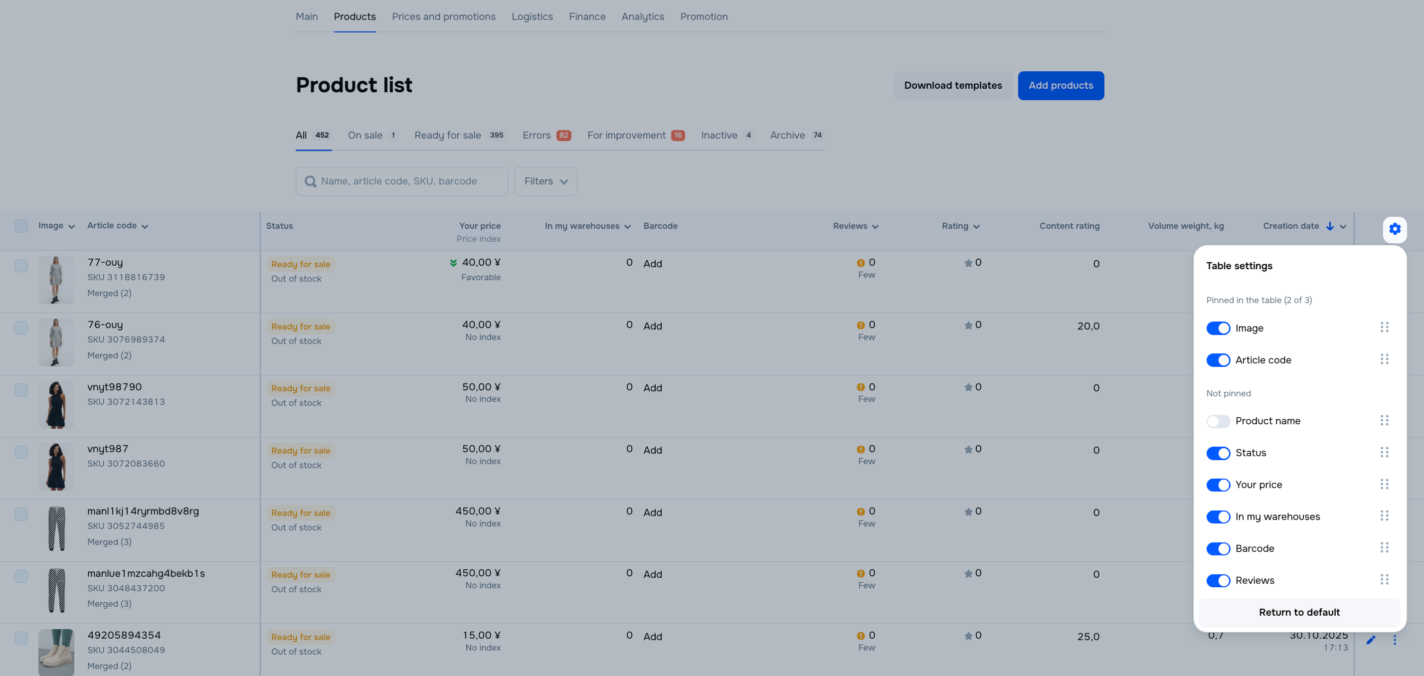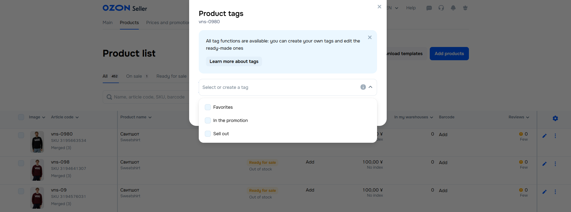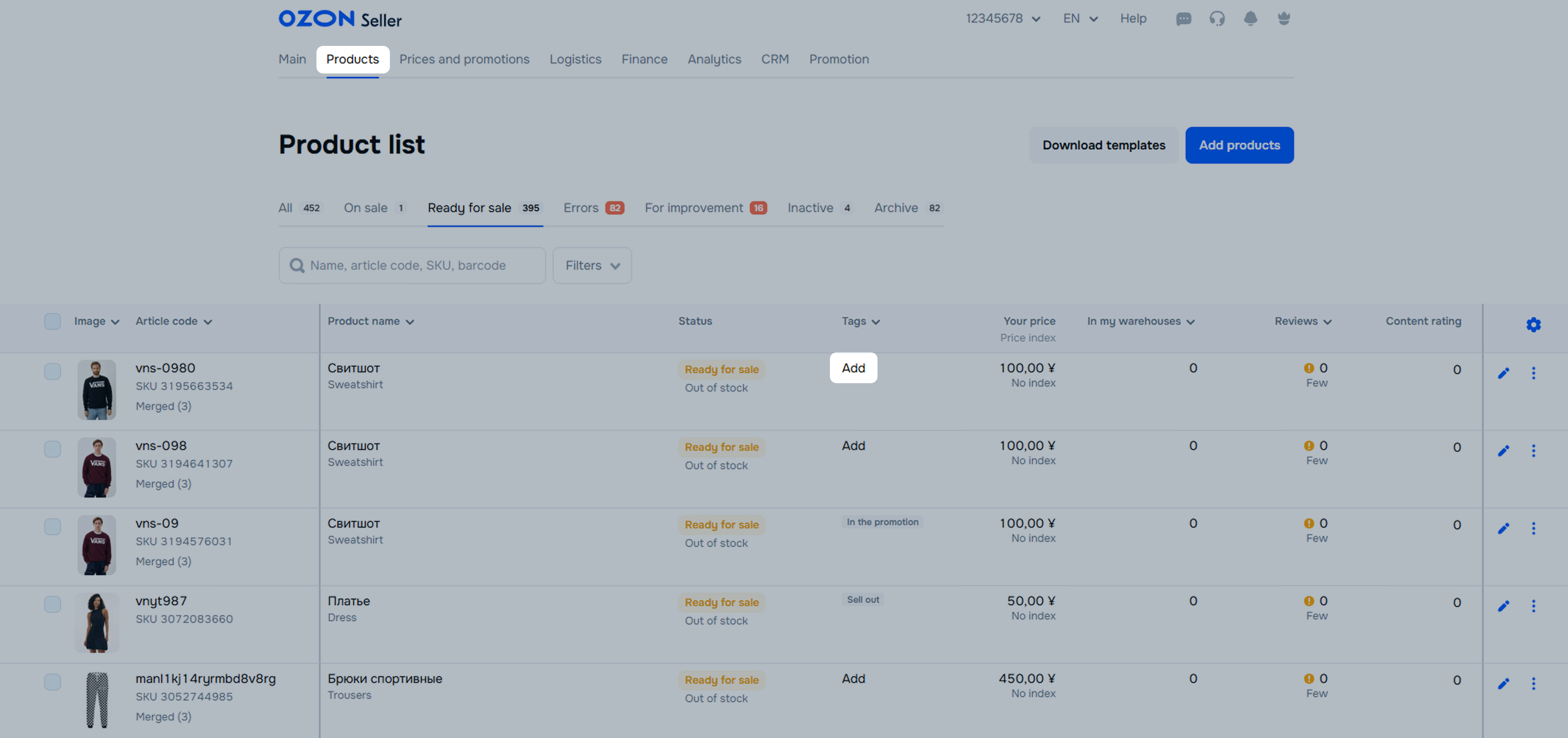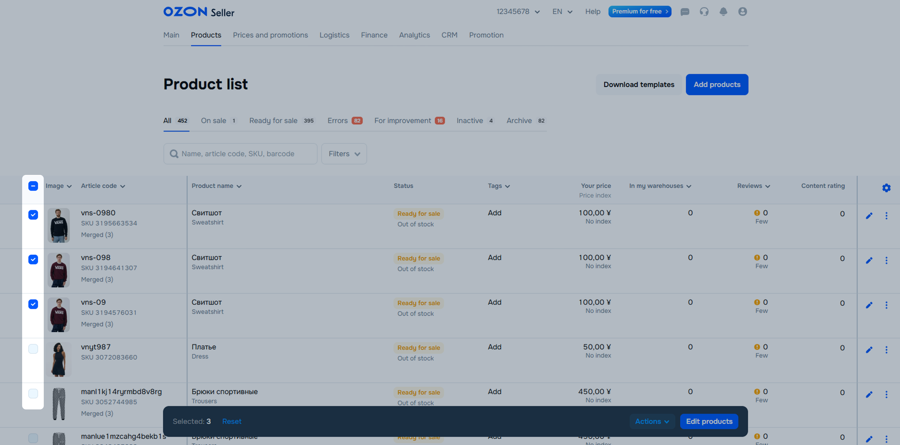 Each product has an Ozon SKU ID. They are displayed in the “Article” column.