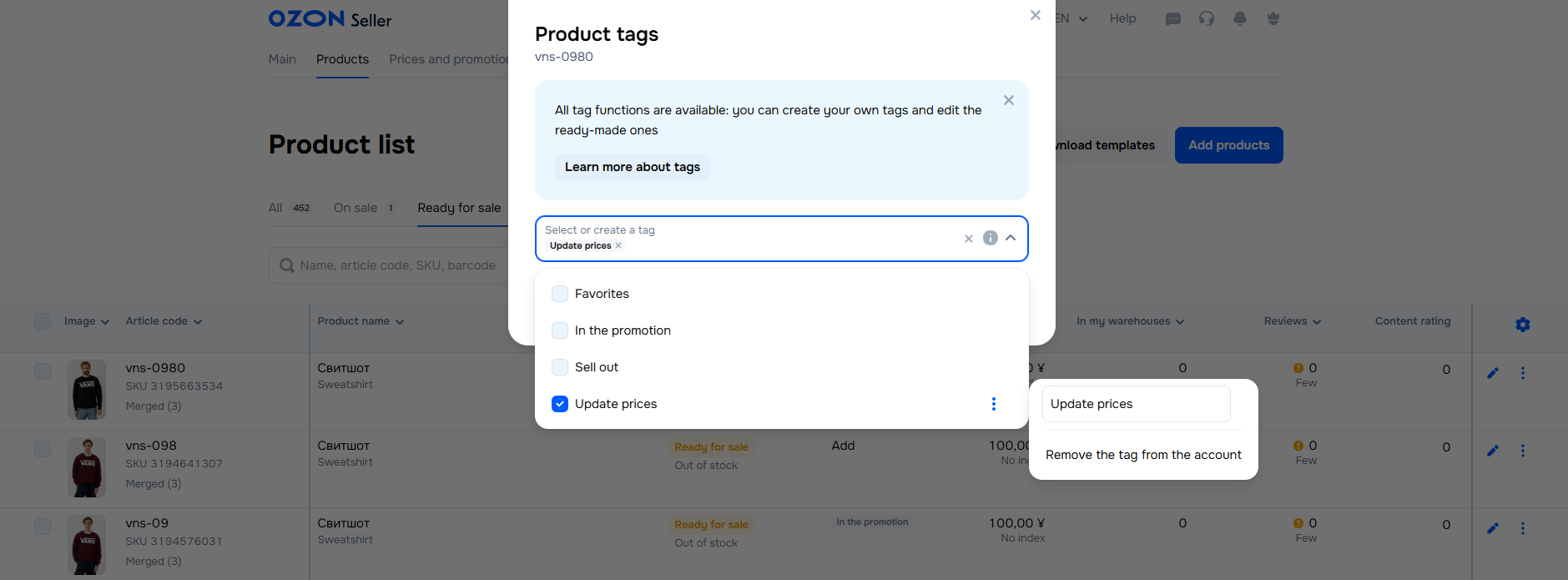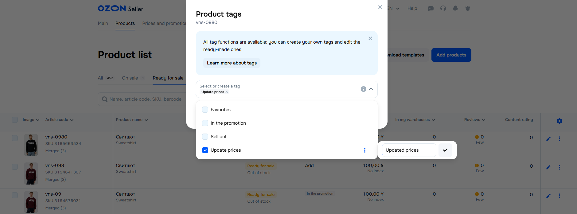 Click Save. When adding a tag, we don’t send the product for moderation again.