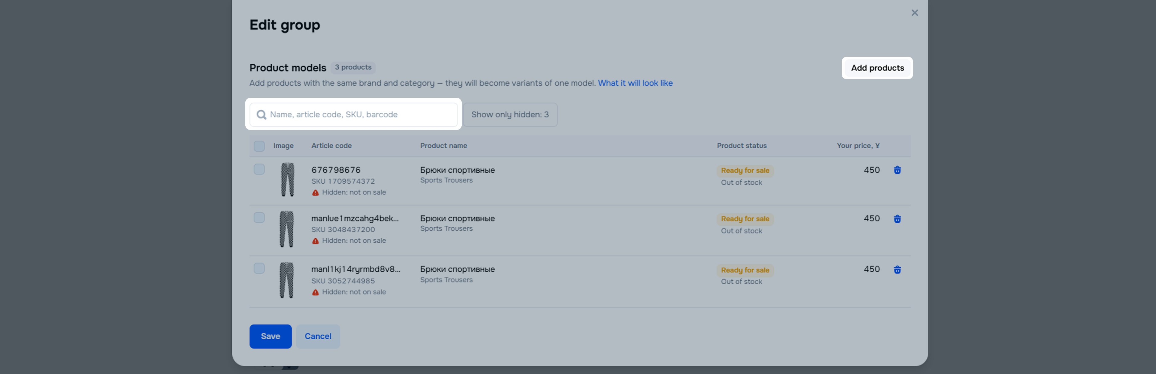 Click Create a group → Add products. Enter the product name, article code, SKU, or product barcode. You can also use filters by category and brand.