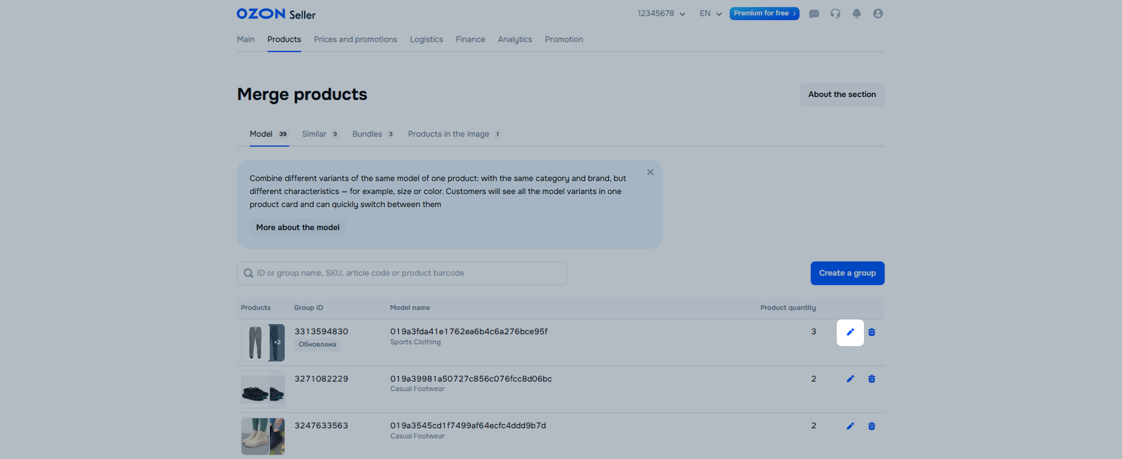 If you want to separate all the products merged into one model, open the Products → Merge products section. On the Model tab, click