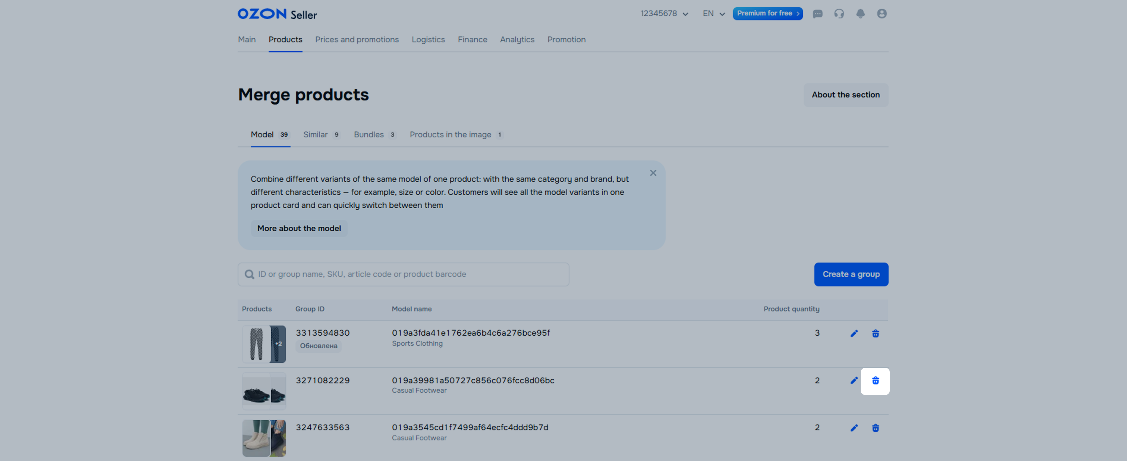 In the Creating a group table, you can view the products you merge into one model. To remove an extra product, click