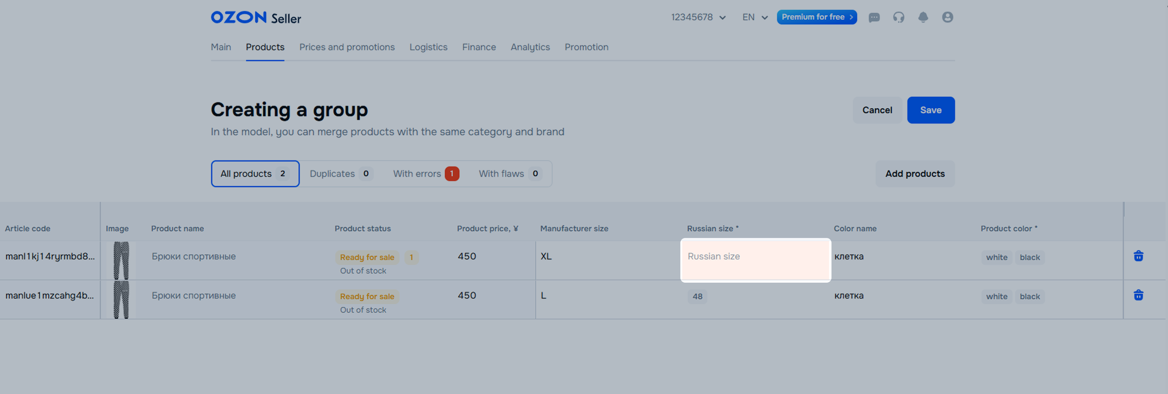 You can merge variants of the same product: items of the same model, but with different characteristics, such as color, volume, size, or weight.