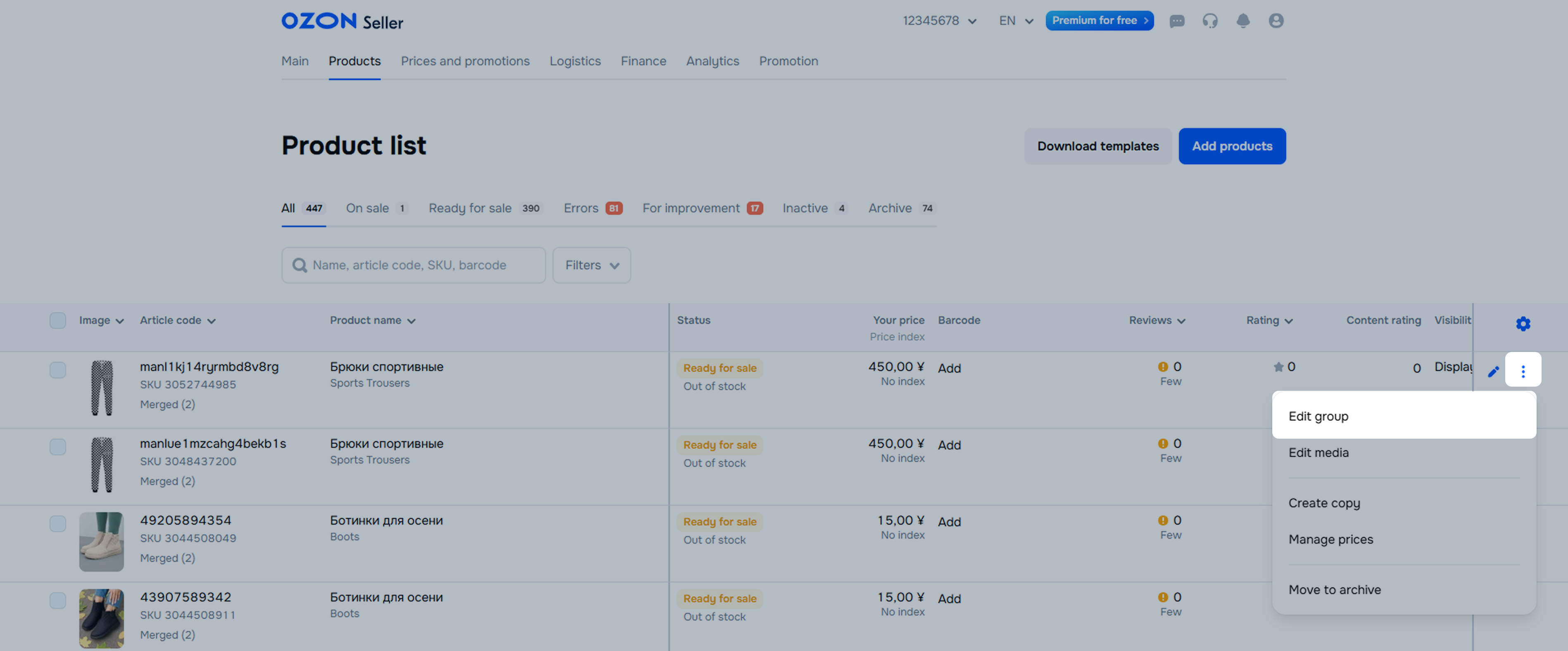 If you want to merge products, but they don’t have suitable characteristics, try other merge types. For example, you can add products to a Similar, Bundle, or Products in the image group.