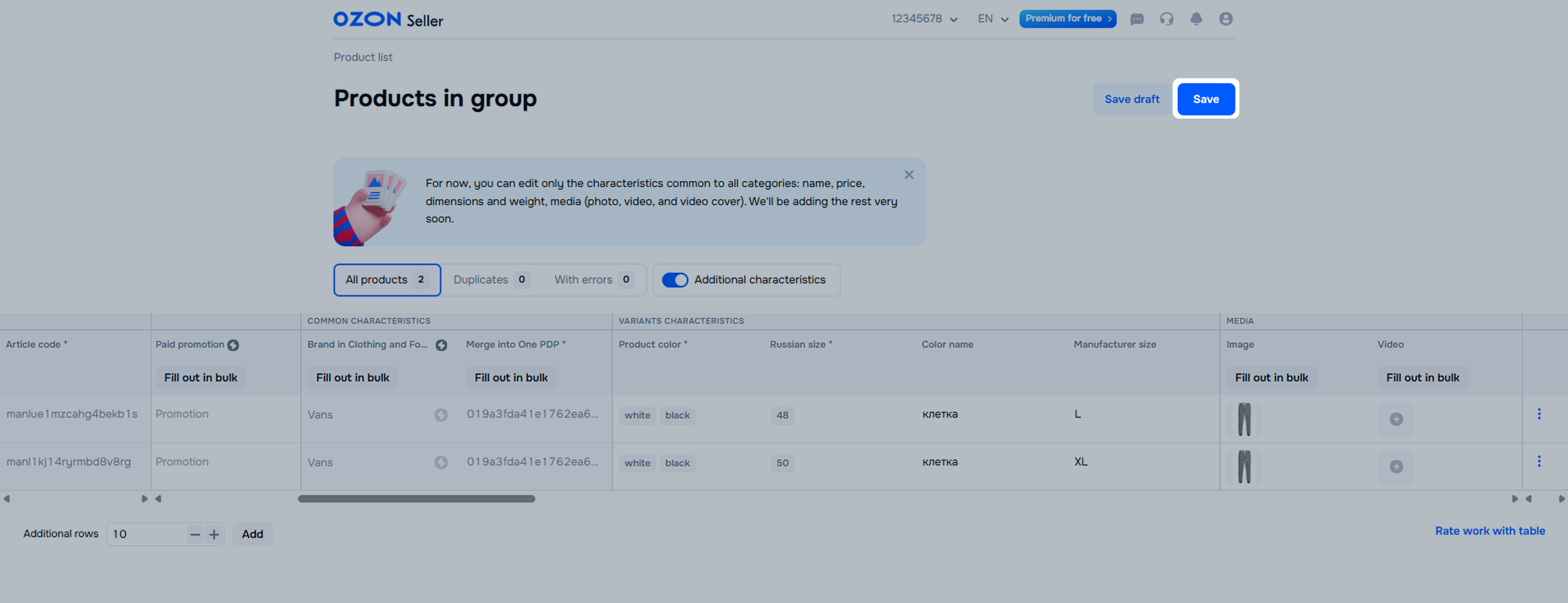If you fill in all the characteristics correctly, the variants will be compiled on one PDP. It takes about 24 hours for the system to do this in any of the loading methods.