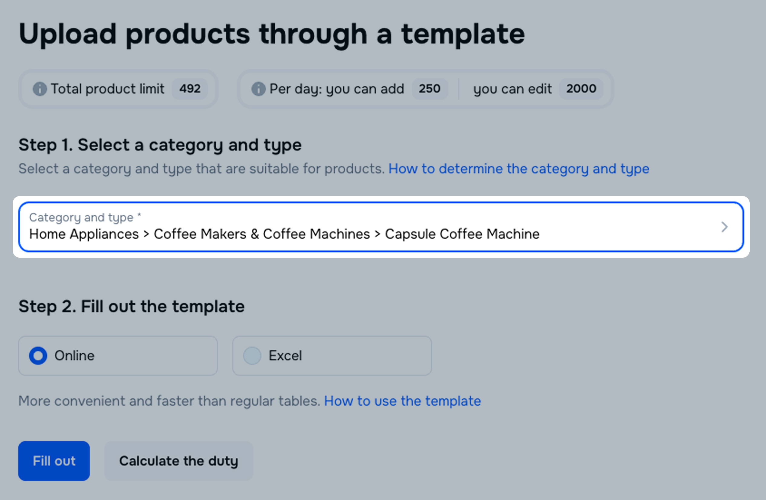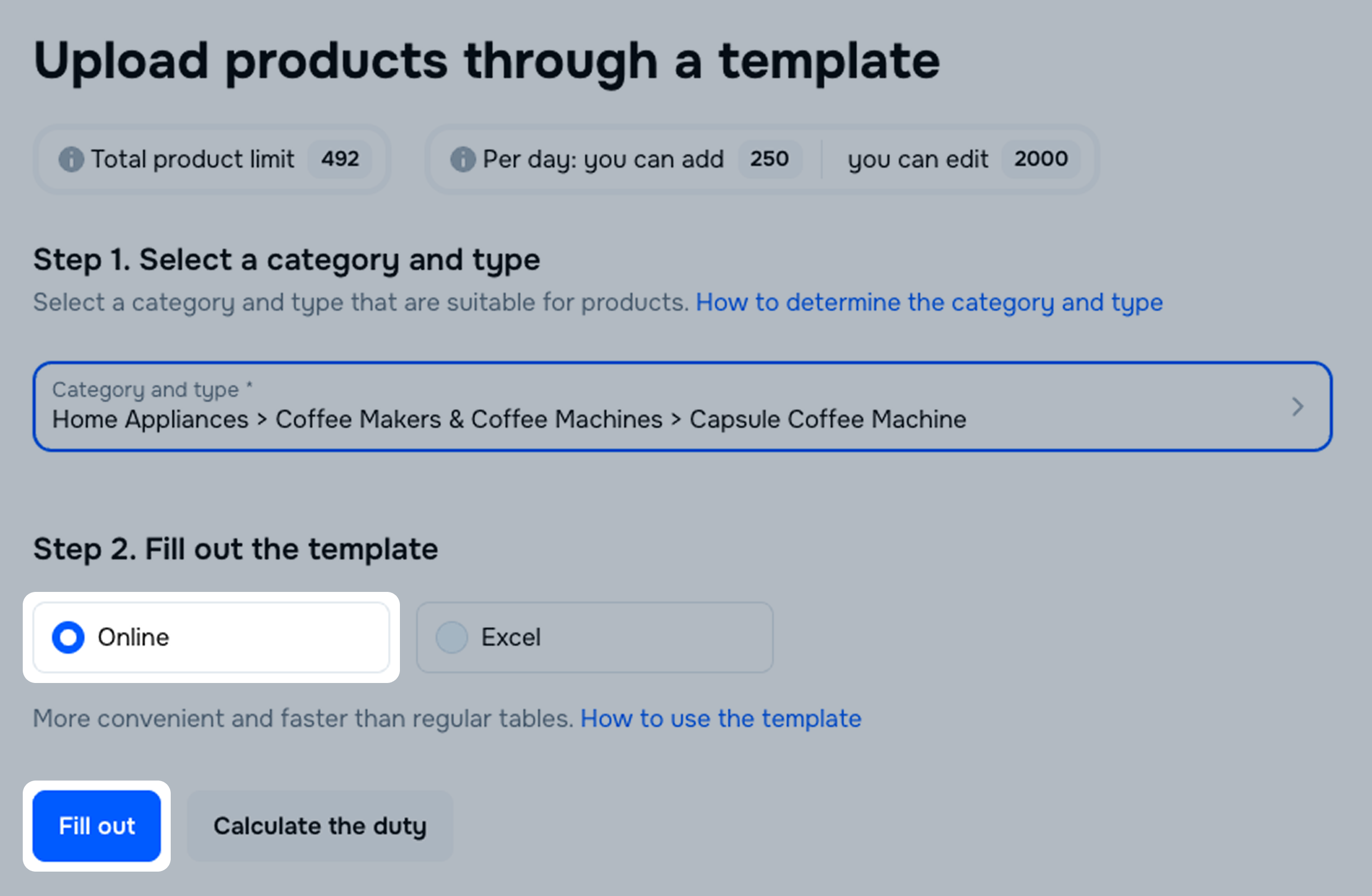 You can view a list of all the templates you’ve worked with via online tables in the Products → Add products → Via template section. On this list, you can track the history and status of online templates, draft expiration dates, edit uploaded products, and correct errors.