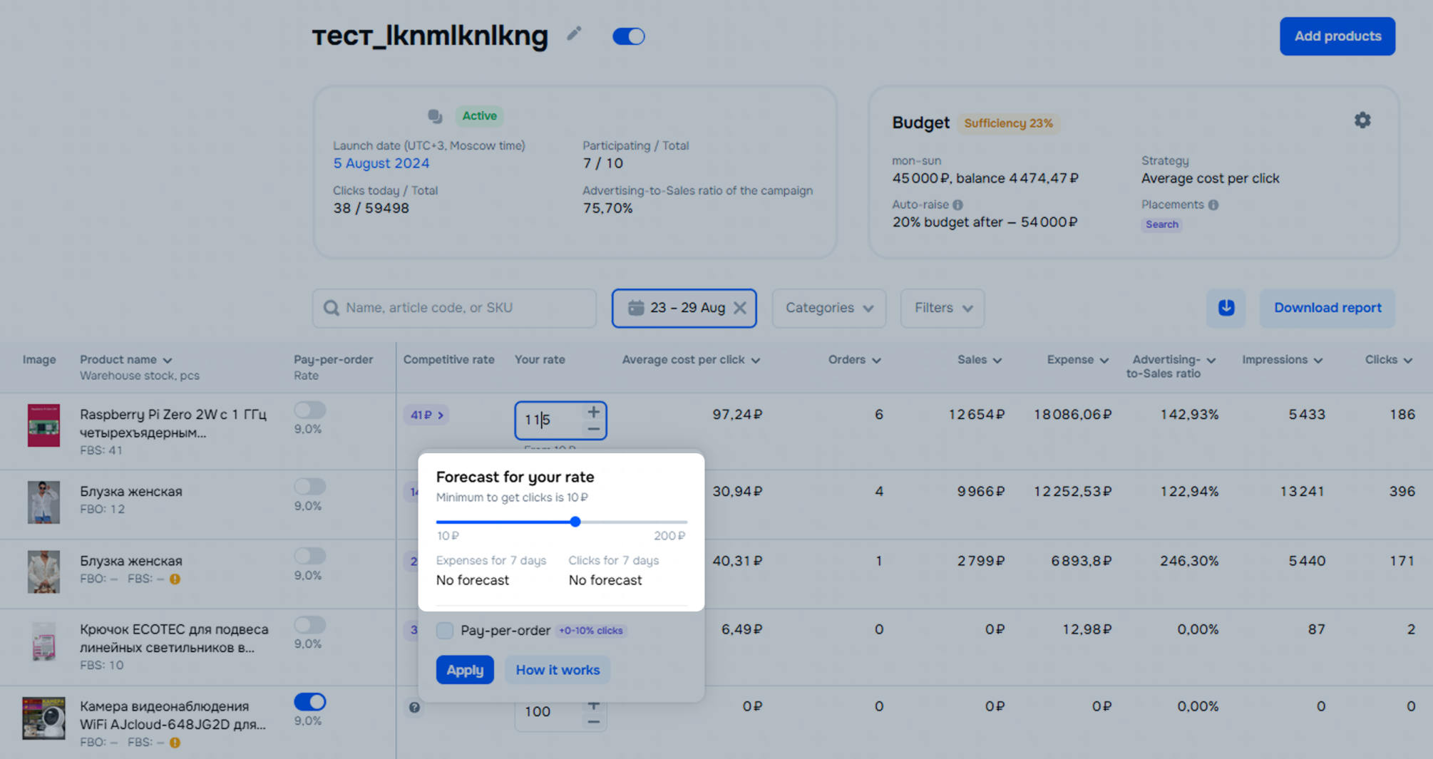 The forecast is calculated the next day after you add products to the campaign. We take the rates of competitors from previous auctions and the number of clicks they received. We analyze them and calculate approximate values that you can refer to when setting rates for products.
