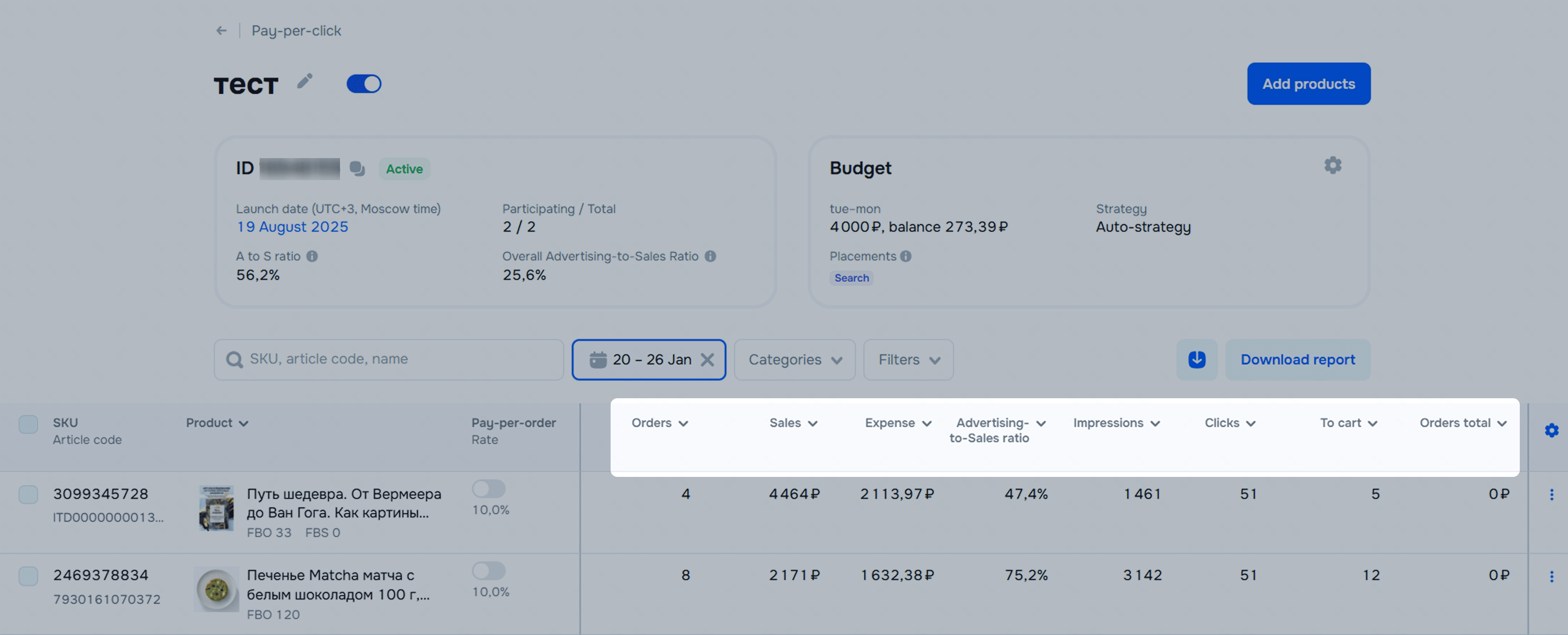 - In the Promotion → Pay-per-click section, go to the campaign page, click Download report and view the “Model orders” column.