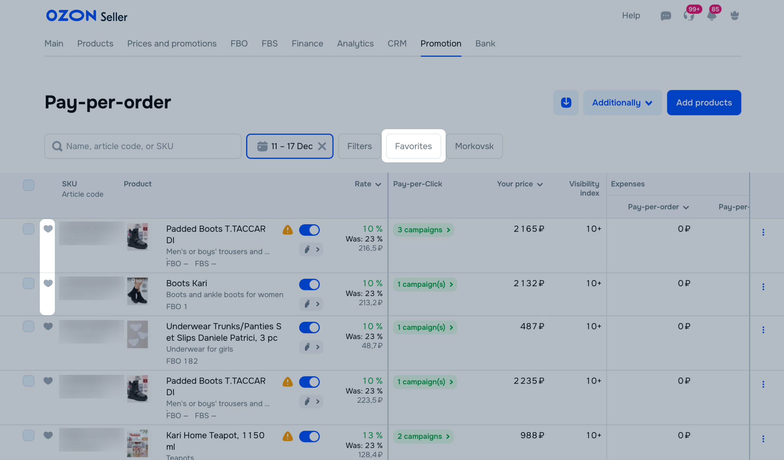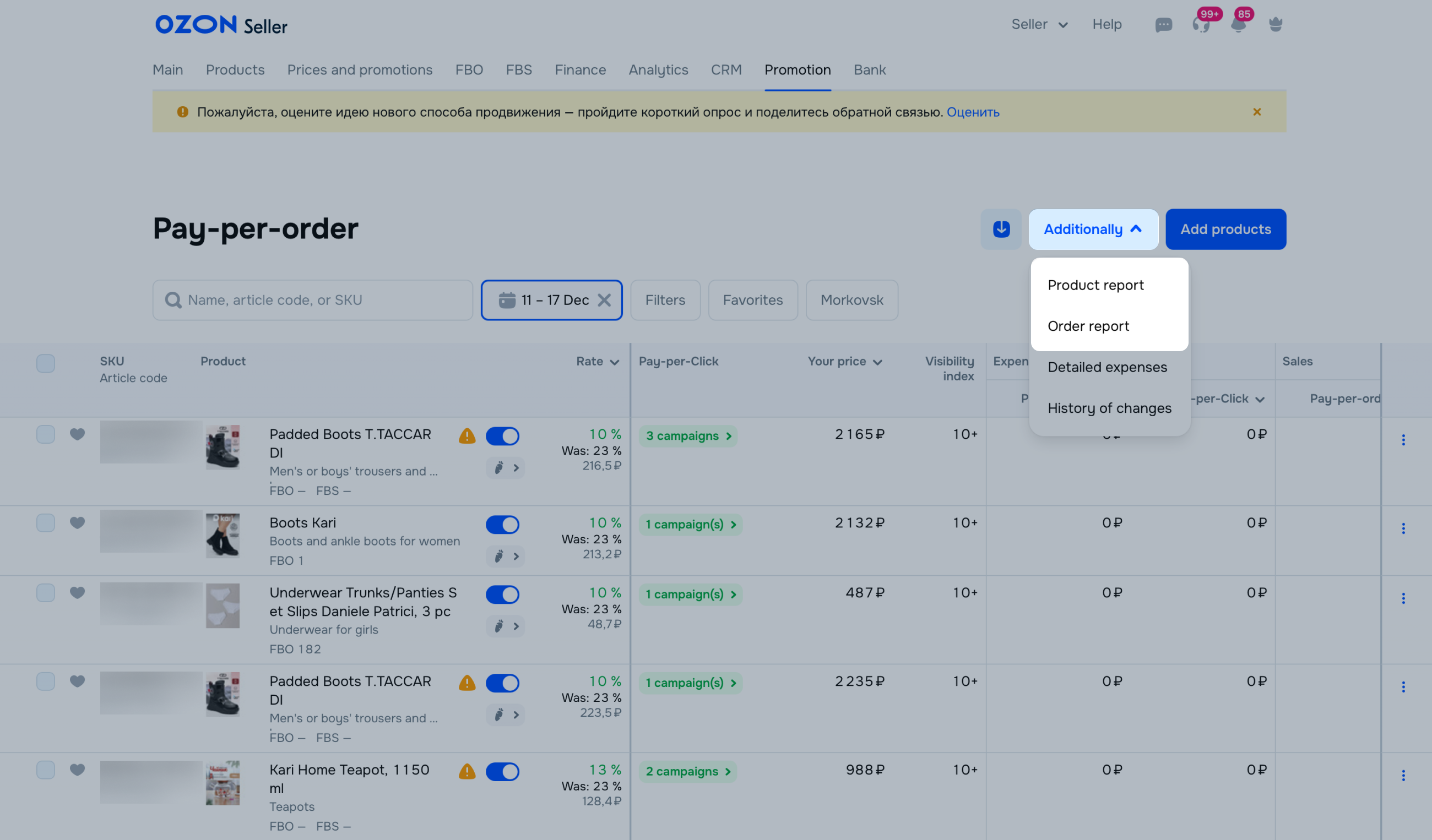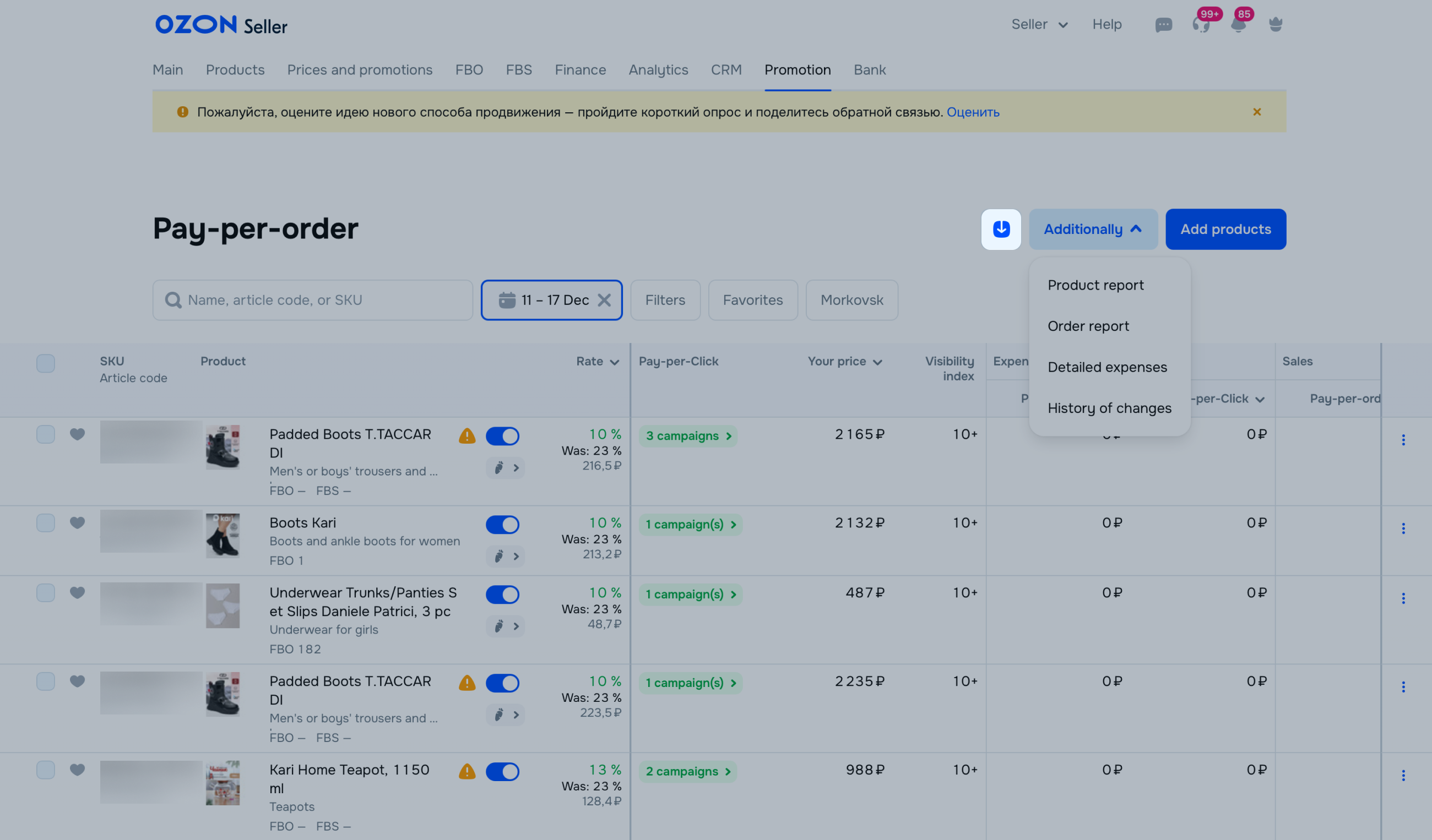 - Pay-per-order: number of products purchased during the selected period due to pay-per-order promotion. The metric includes statistics on all products merged into one PDP by color, size, volume, or other characteristics. For example, if a customer clicks on the promoted PDP of a blue T-shirt, but ends up choosing a red one, we take into account the order with the rate assigned to the product for promotion.