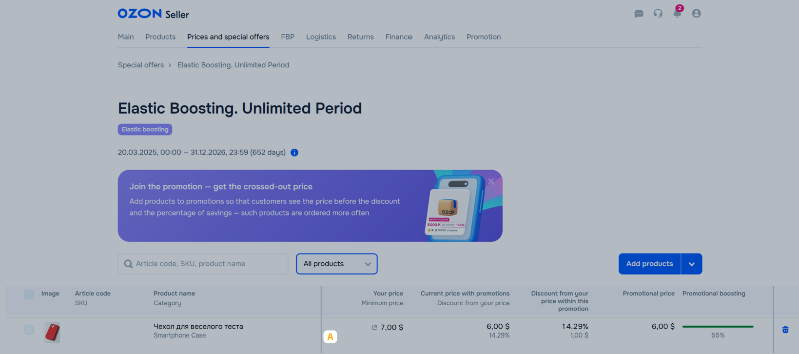 Ozon regularly holds promotions for customers. We define the terms and conditions for them ourselves. You just need to add your products in the Prices and promotions → Ozon promotions section. They will be shown on promotion pages together with Ozon and other partner products.