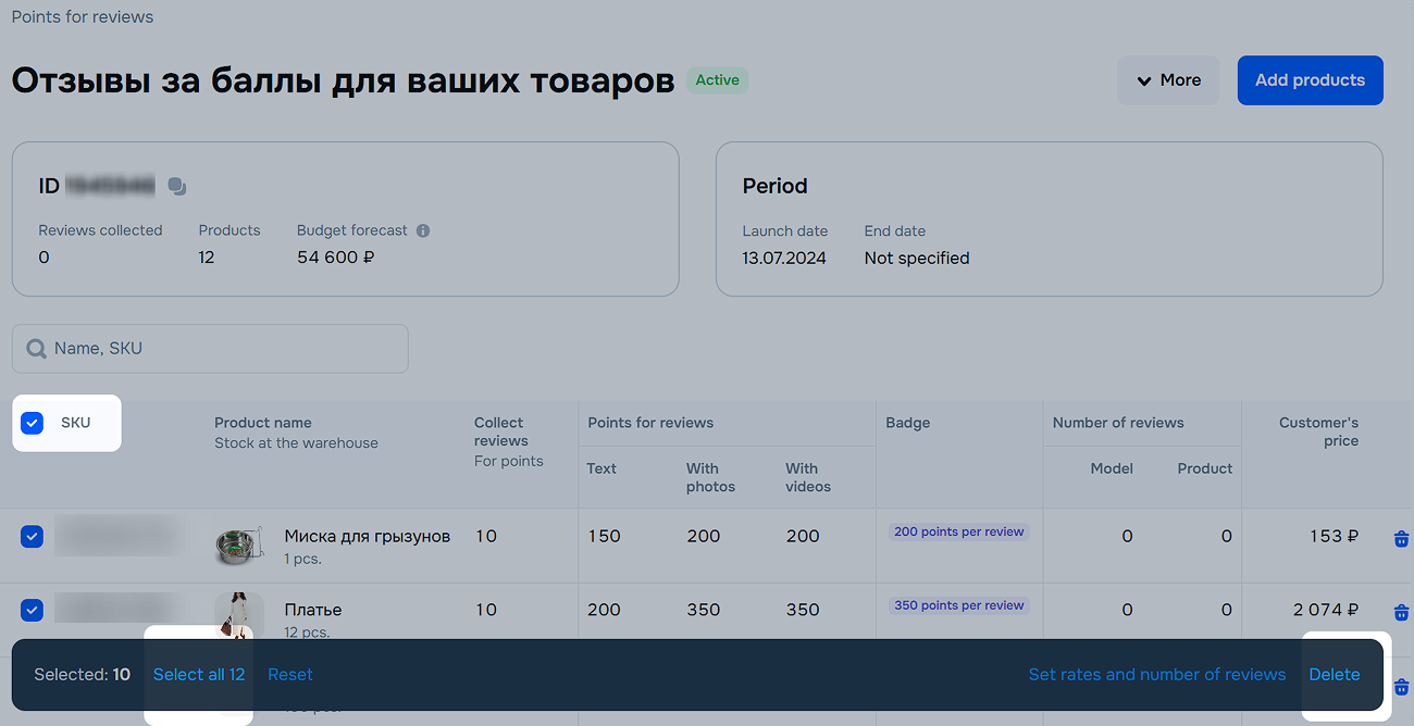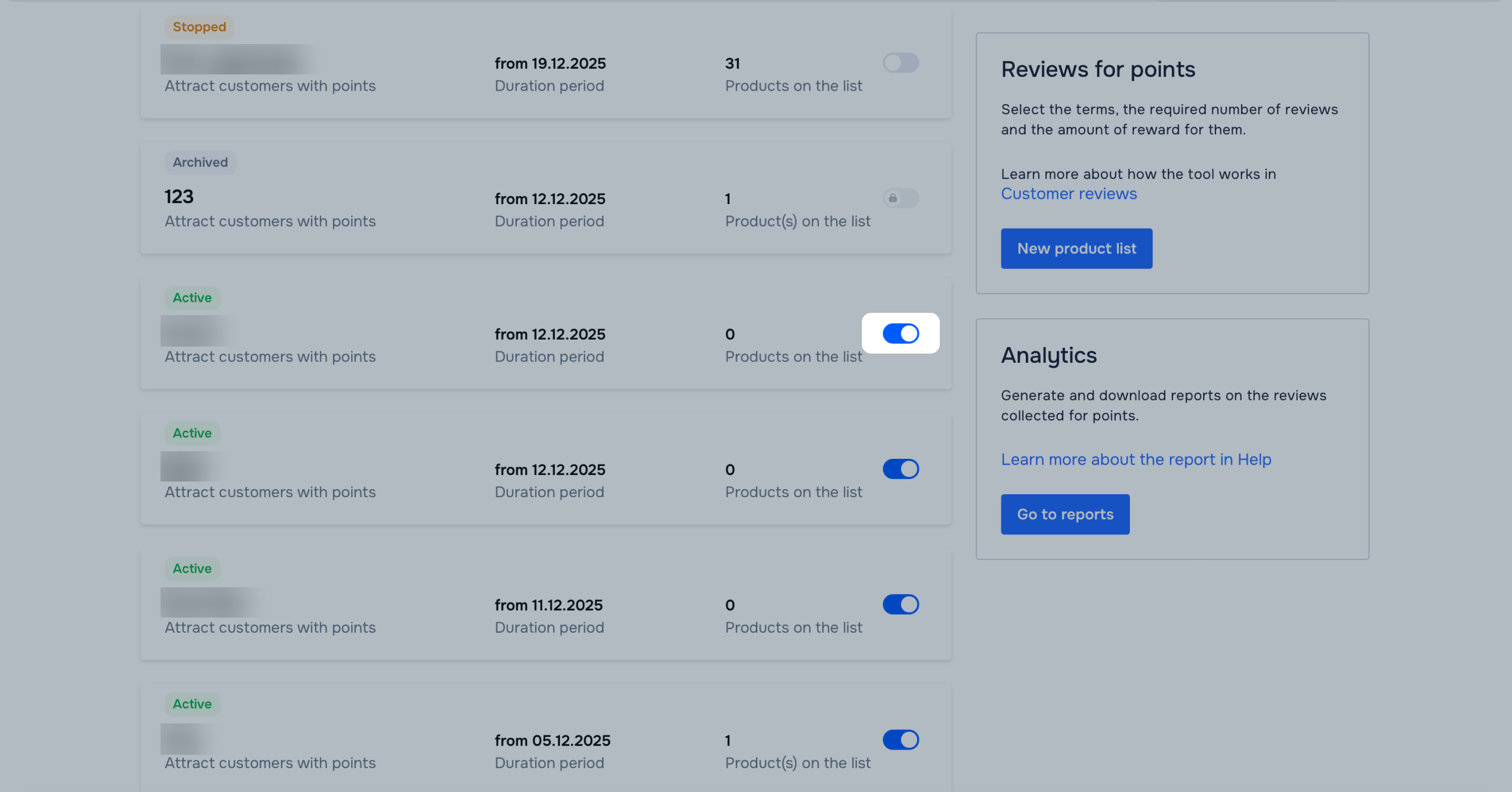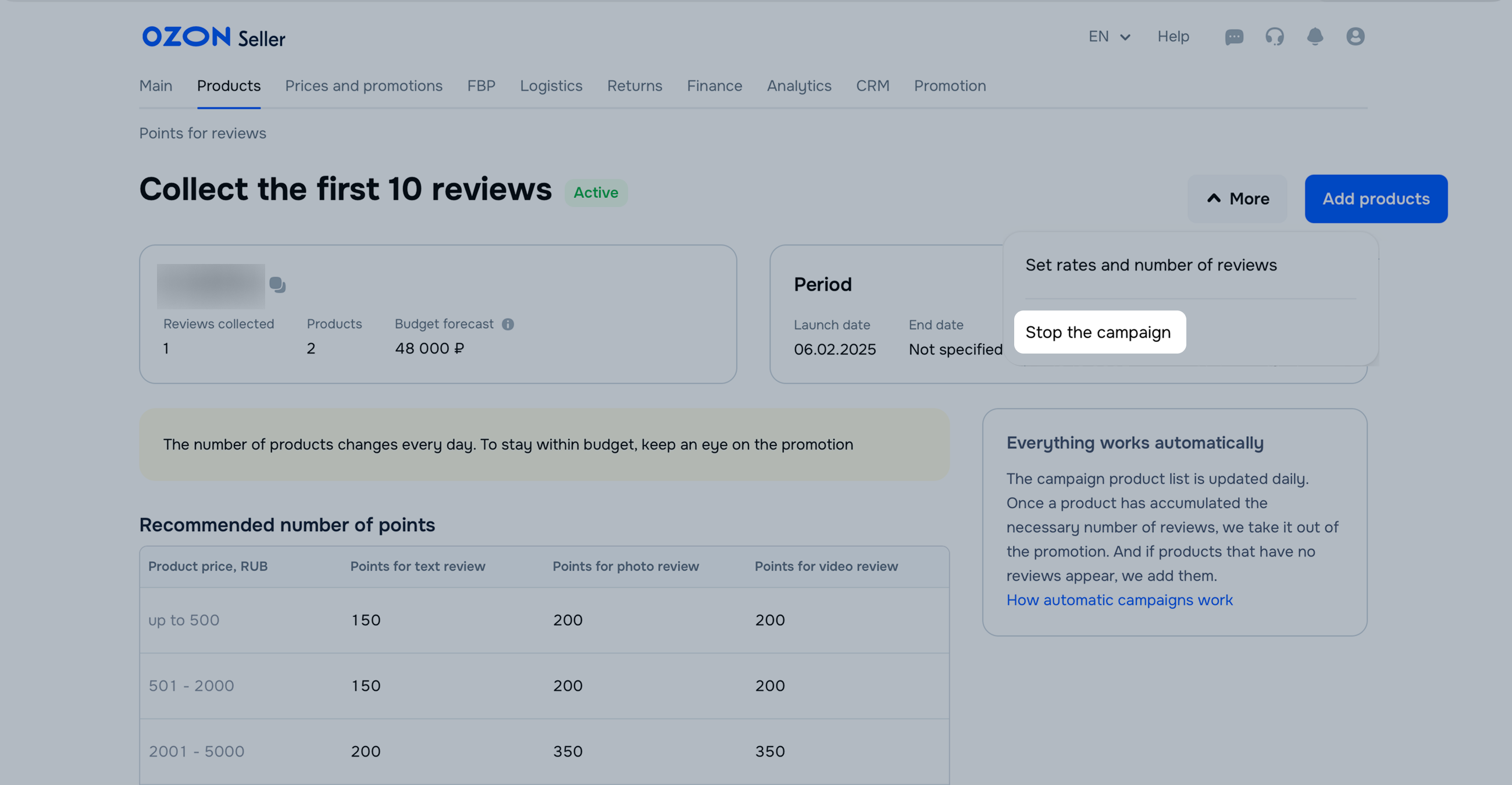After that, the badge with points disappears from the products. If customers bought the products before you disabled the campaign and then left reviews within five days after pick-up, they receive points. In this case, we charge you for the inactive campaign for a few more days.