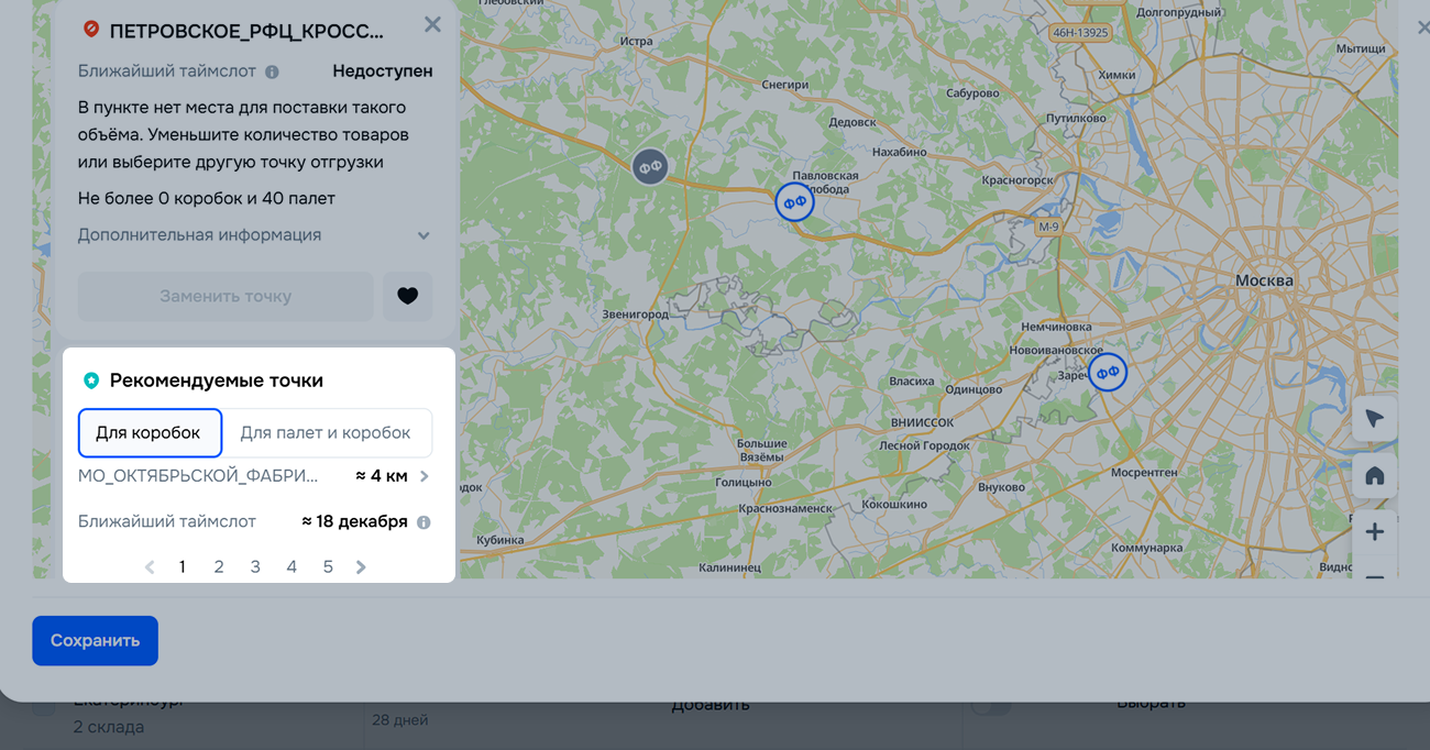Если вы выбрали точку, но она недоступна или мы нашли рядом точки с более ранними таймслотами, покажем альтернативы в виджете Рекомендуемые точки. Чтобы проверить, какие альтернативные точки примут ваш тип грузомест, нажмите Для коробок или Для палет и коробок.