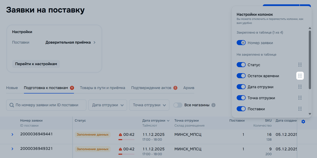 | Просрочено | Вы не успели выбрать дату и точку отгрузки или не привезли товары в свой таймслот. Создайте новую заявку на поставку, старая попадёт в архив. |