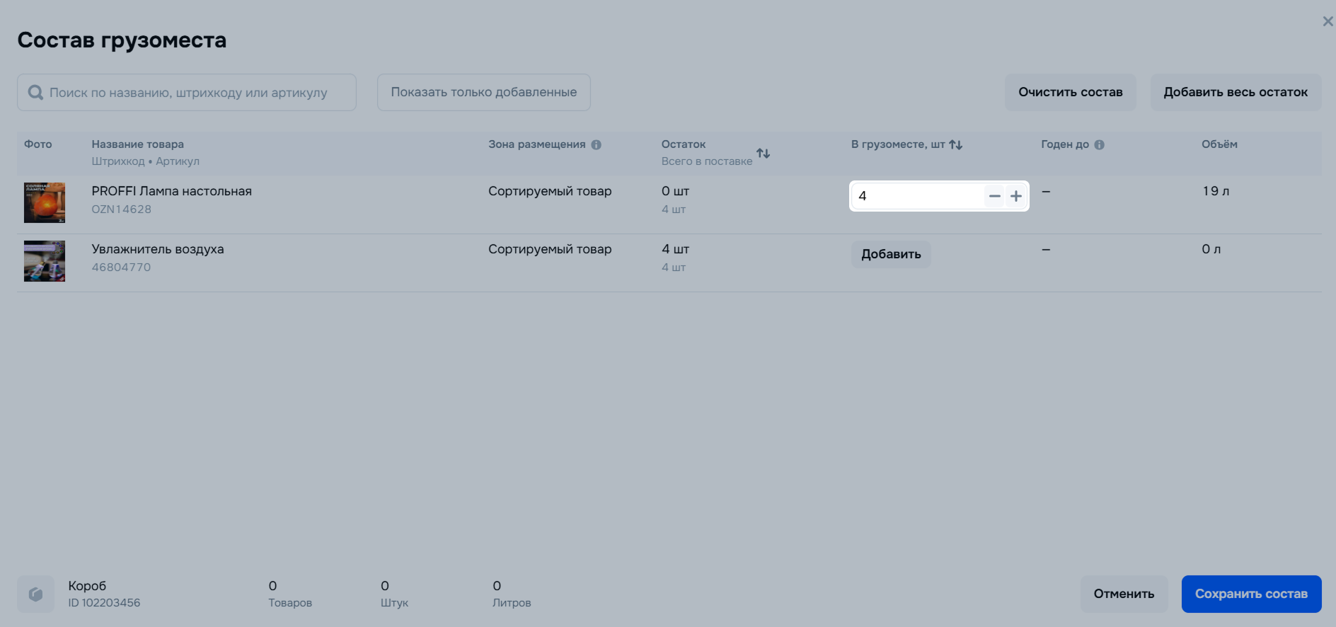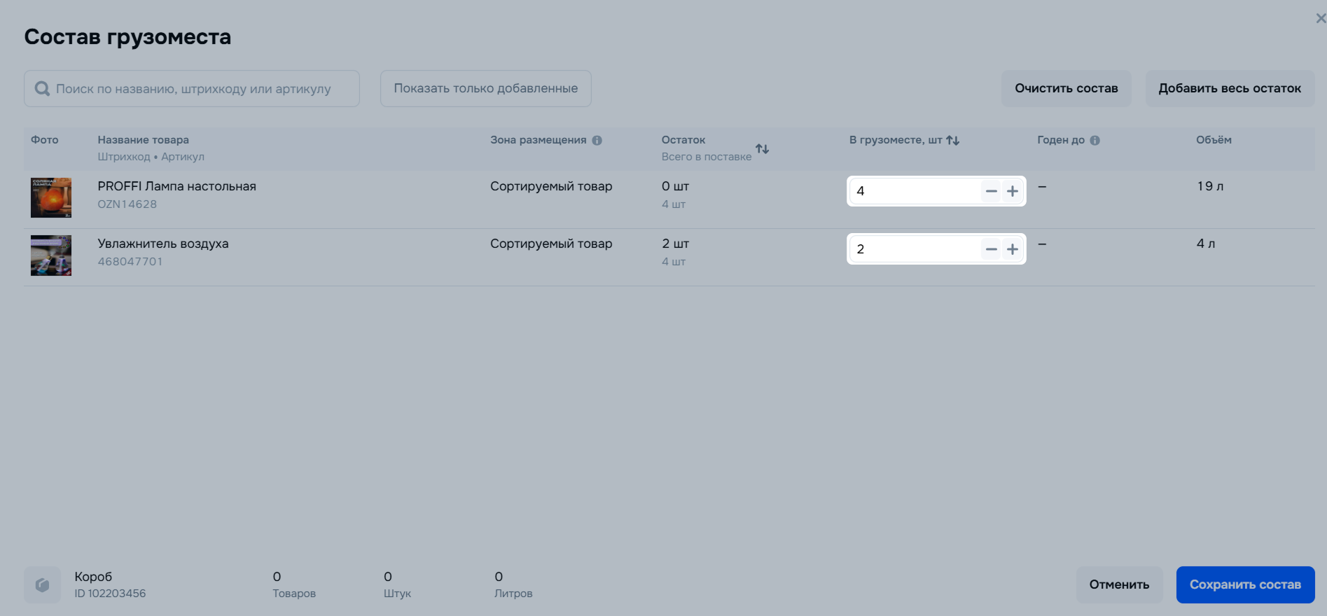 Чтобы удалить товар из грузоместа, укажите для него количество 0. При необходимости отфильтруйте список по добавленным товарам.