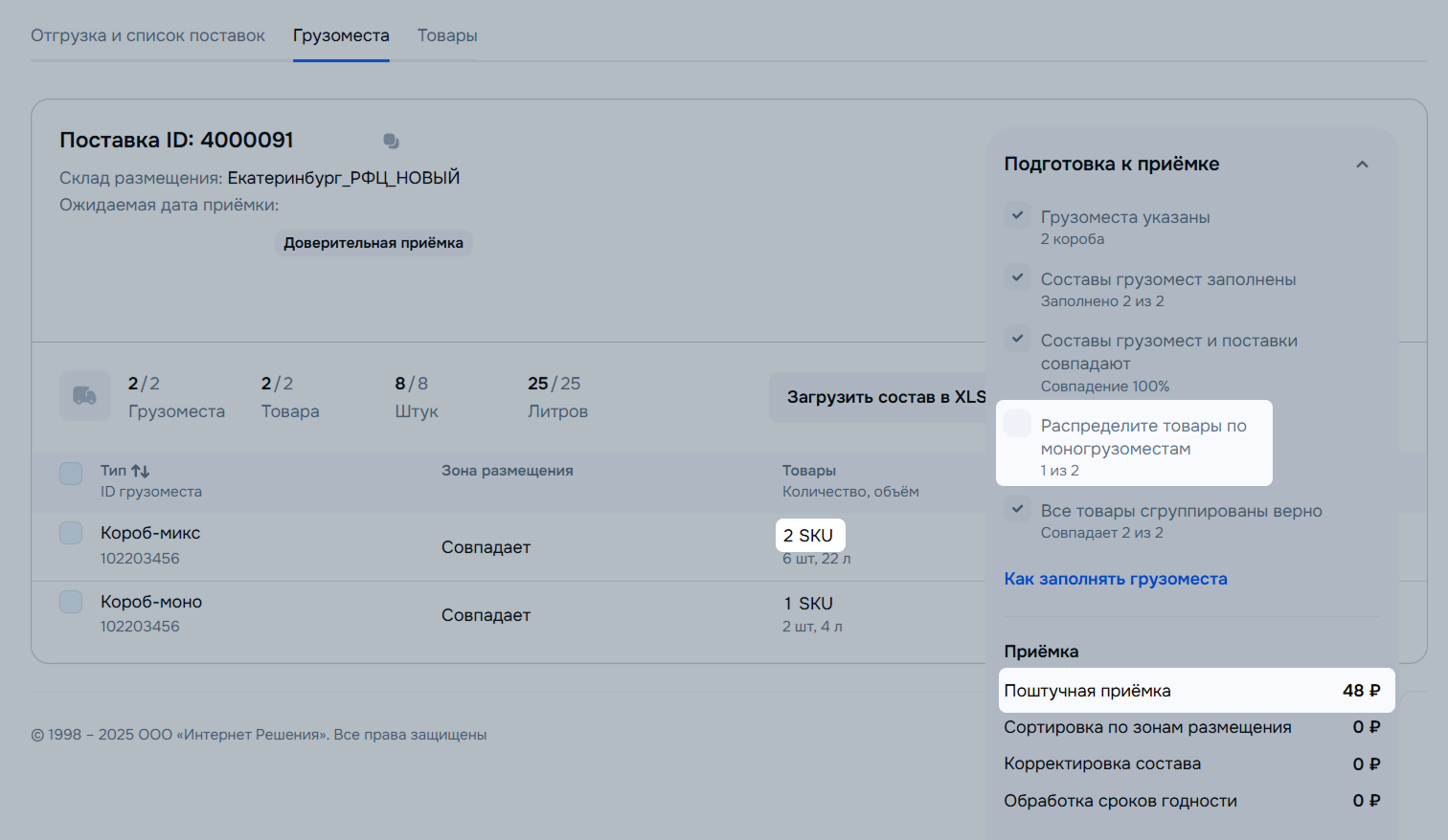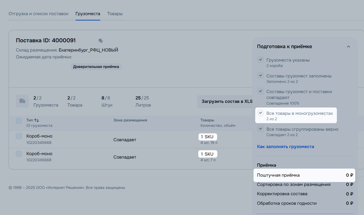 Так как в каждом грузоместе будут товары с одним SKU, дополнительной платы за приёмку не будет.