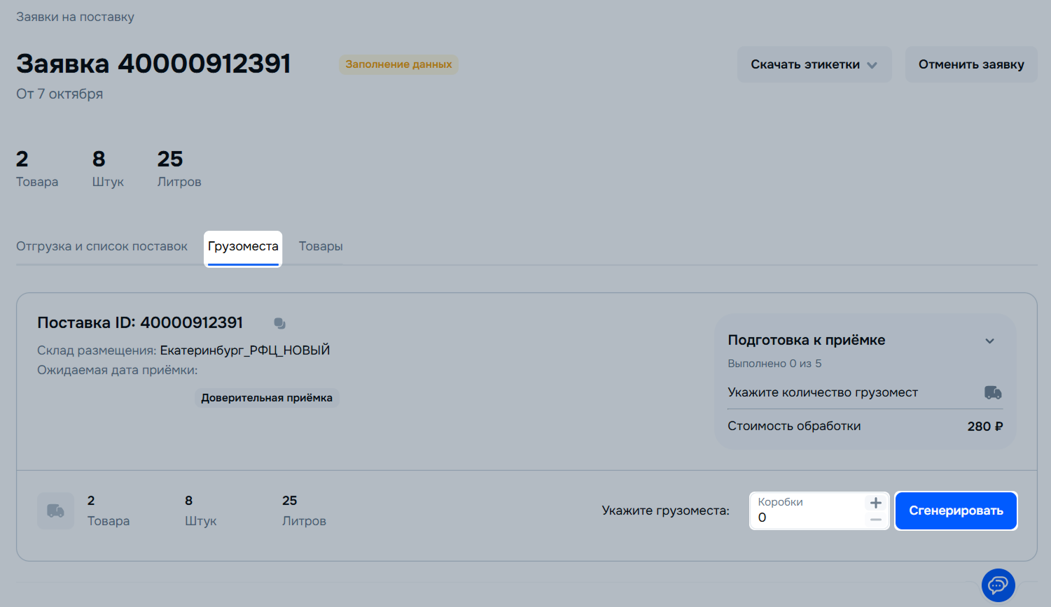 Количество грузомест должно совпадать с количеством SKU поставляемых товаров, чтобы за приёмку не было дополнительной платы. Например, если поставляете товары с двумя SKU, значит, для товаров каждого SKU нужно отдельное грузоместо. Укажите количество грузомест и нажмите Сгенерировать.