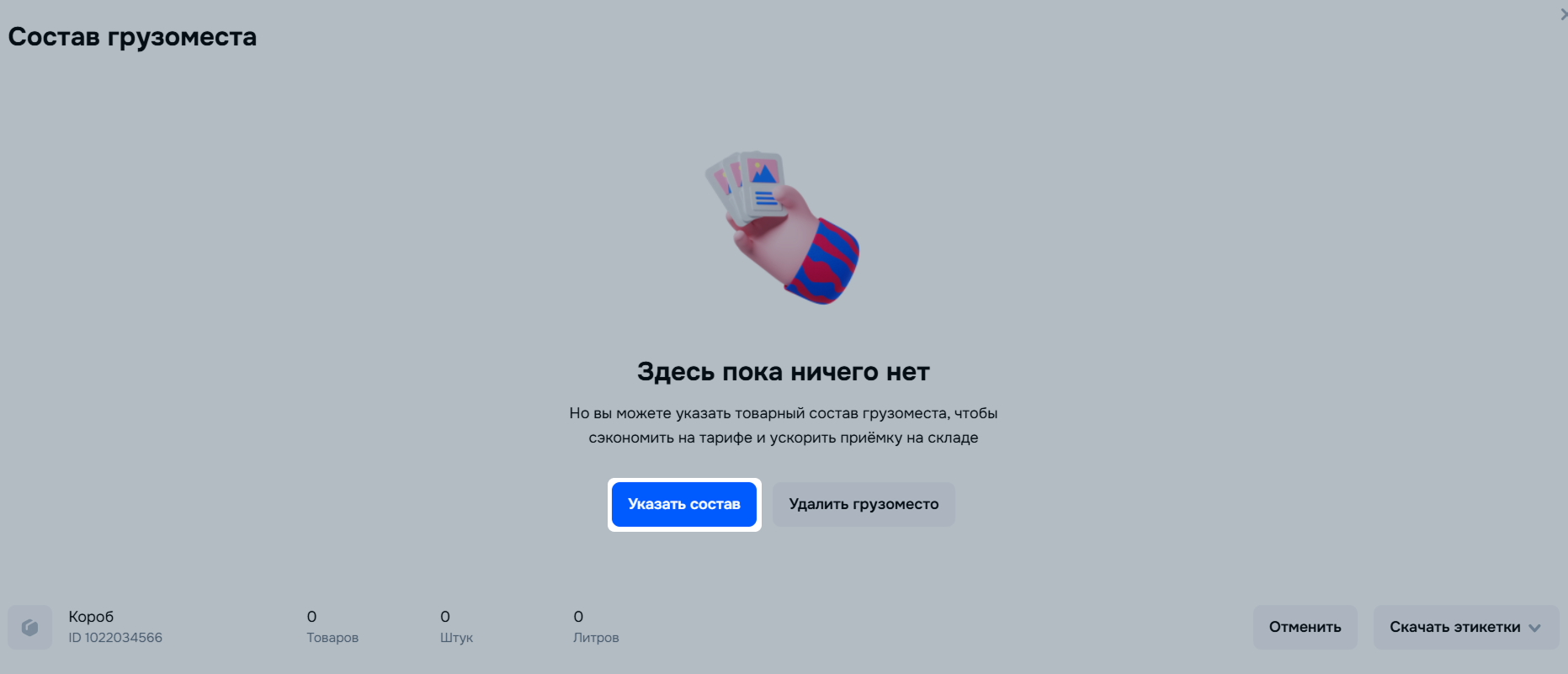 Если вы не укажете его, мы самостоятельно внесём данные, но это будет платно. Если часть грузомест останутся пустыми или не все товары распределятся по грузоместам, система определит, что вы не указали товарный состав всех грузомест.