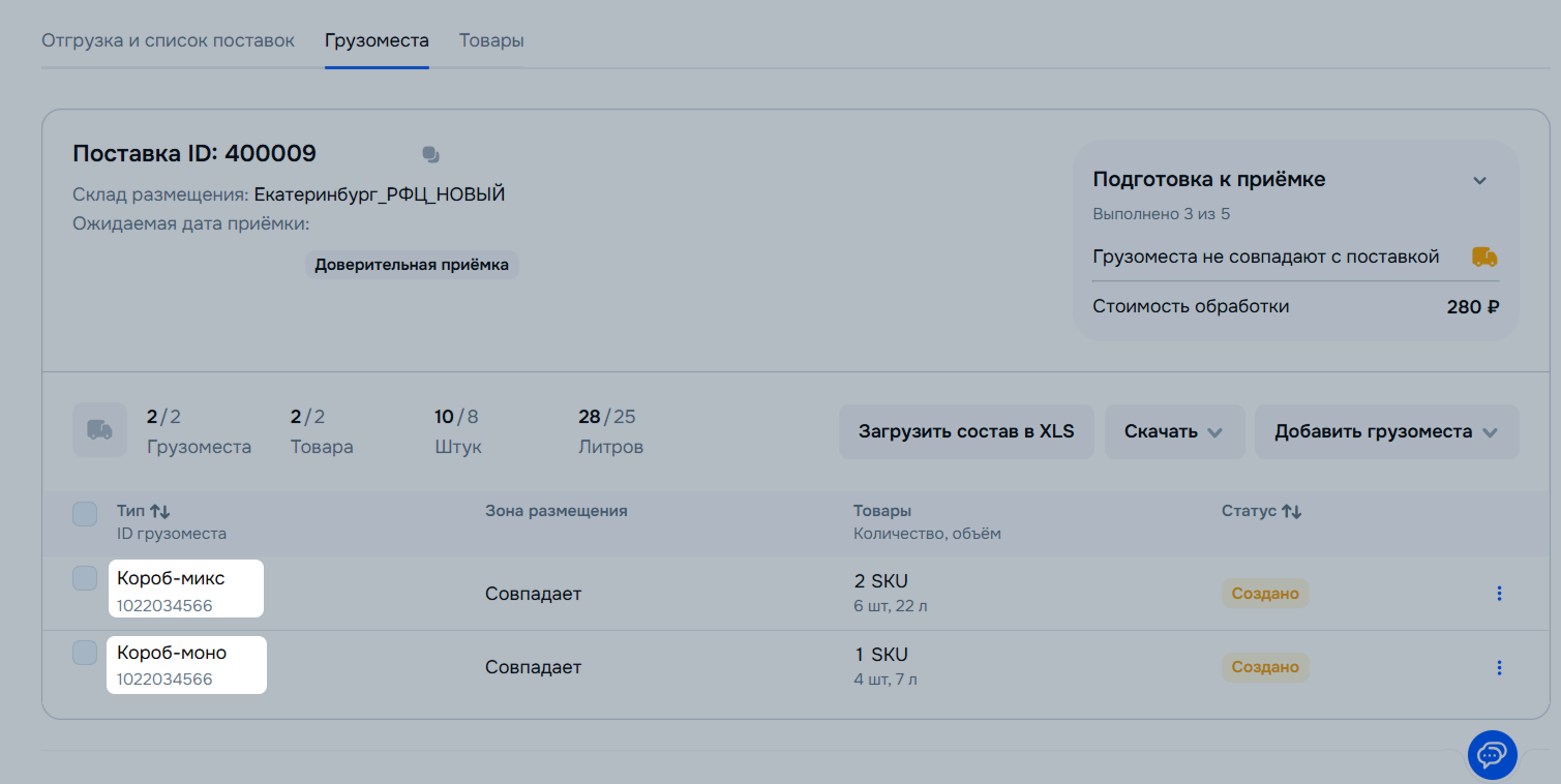 Состав грузомест в шаблоне обновится. В информации о поставке отобразится общее количество товаров и количество указанных в грузоместах. Если данные не совпадают, заново загрузите состав или отредактируйте его вручную.