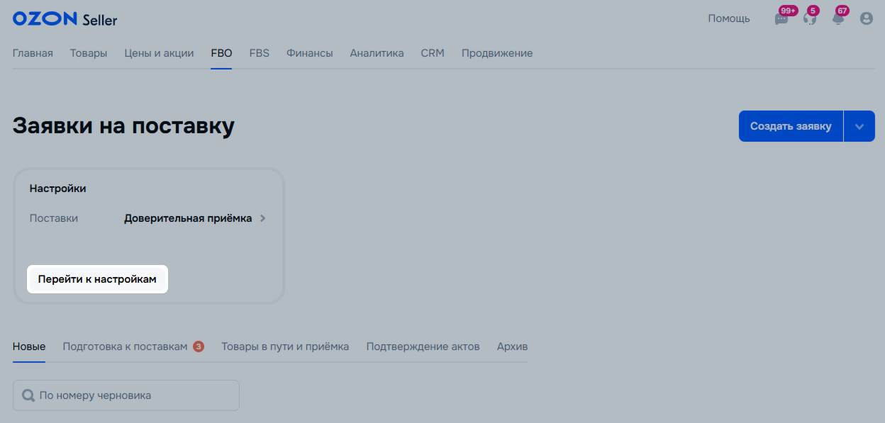 По умолчанию для всех грузомест включим доверительную приёмку — вы увидите настройку в разделе FBO → Заявки на поставку в виджете Настройки. Чтобы изменить параметры приёмки, нажмите Перейти к настройкам и выберите нужный вариант.