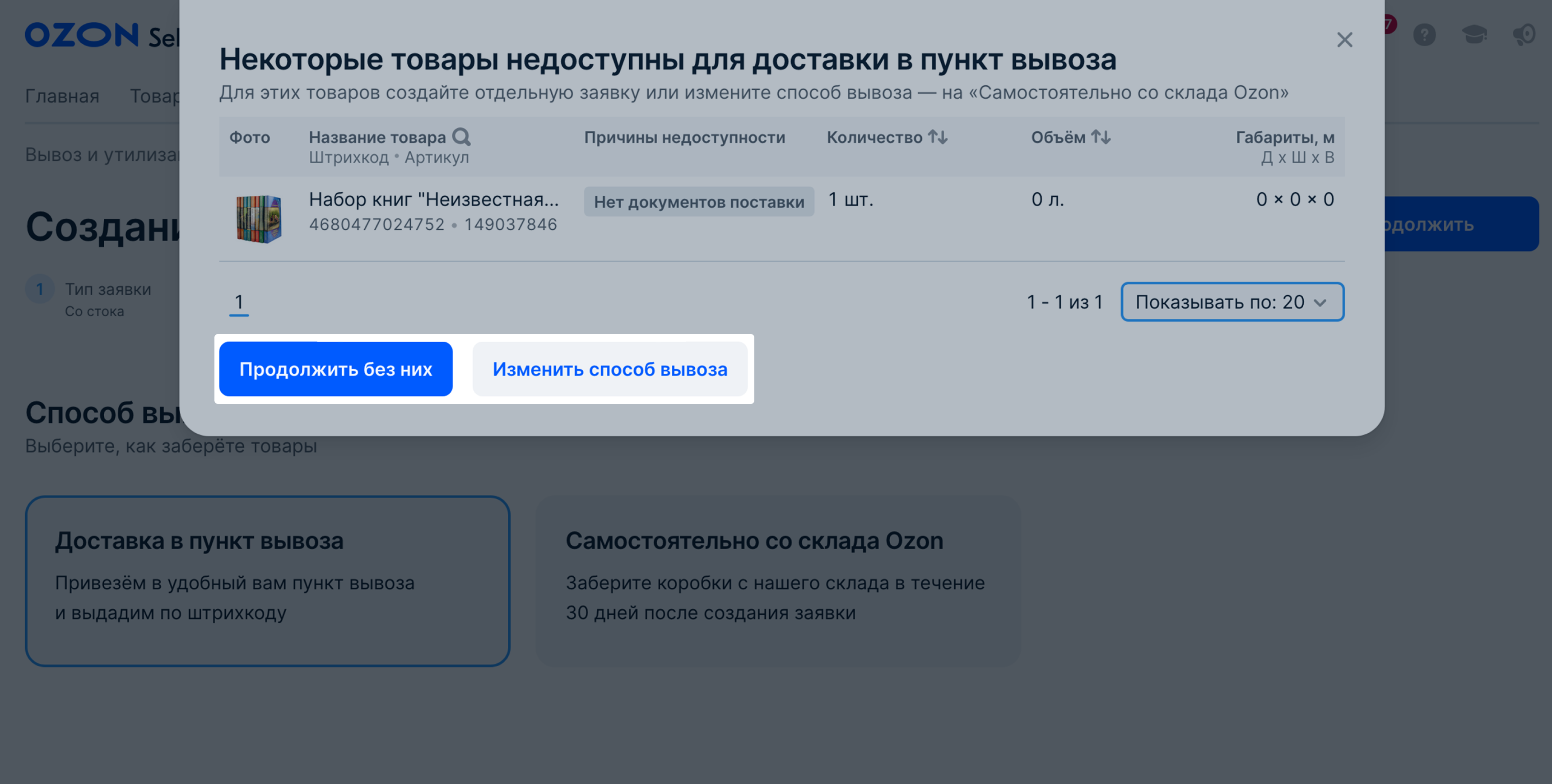 Если выбранные товары нельзя вывезти, покажем предупреждение при создании заявки на шаге выбора способа вывоза. Вы можете: