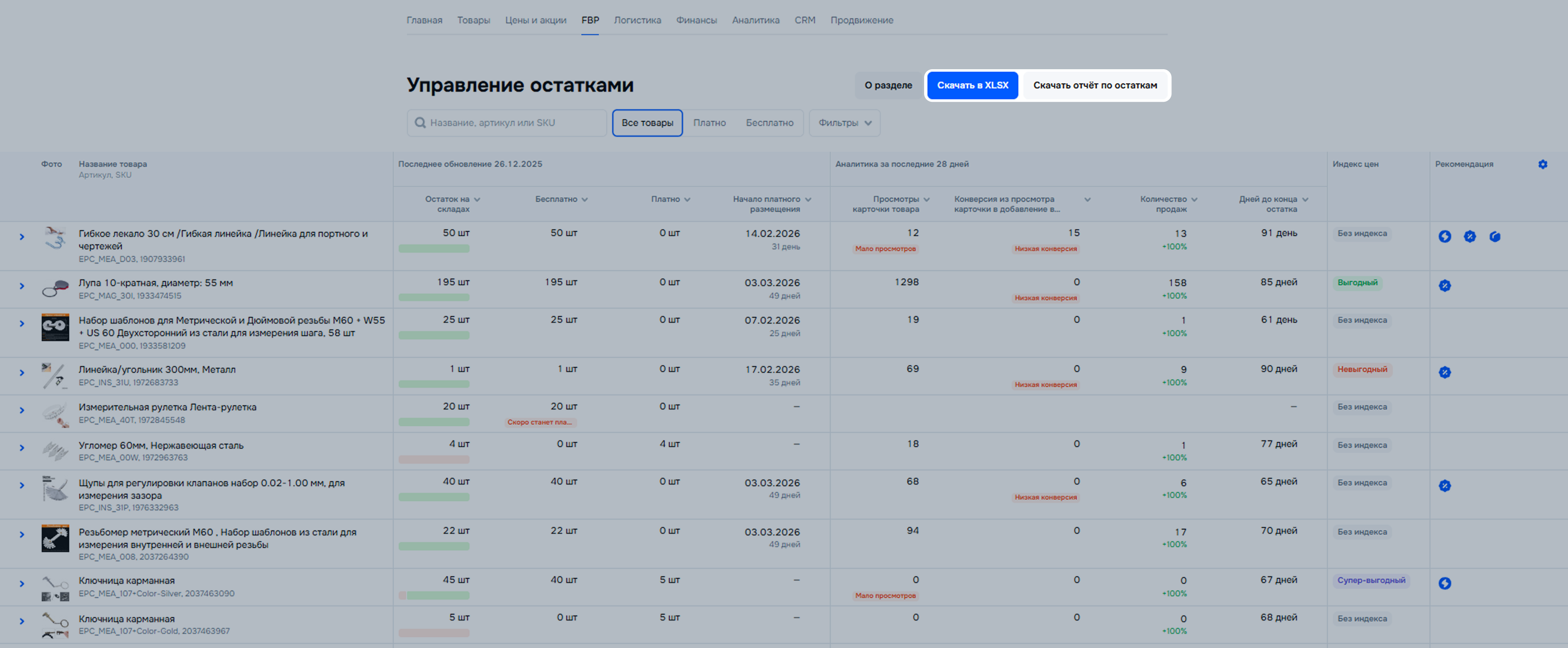 В разделе FBP → Управление остатками показываем детальную информацию по всем товарам с остатками на складах FBP, чтобы вы могли своевременно принимать решения о вывозе товаров, запуске акции или настройке продвижения. Это помогает сократить расходы на платное хранение и повысить ликвидность остатков.