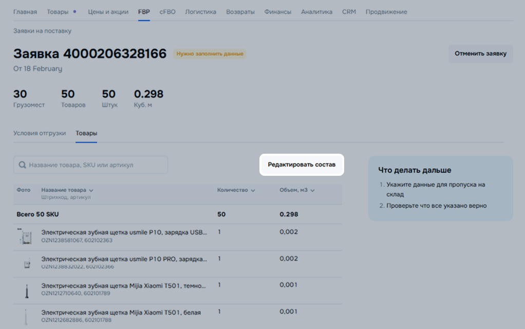 В разделе FBP → Заявки на поставку в строке заявки нажмите
