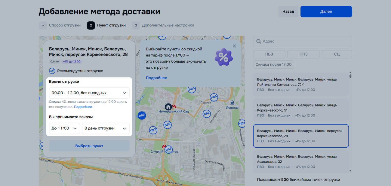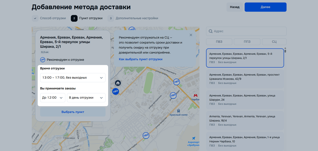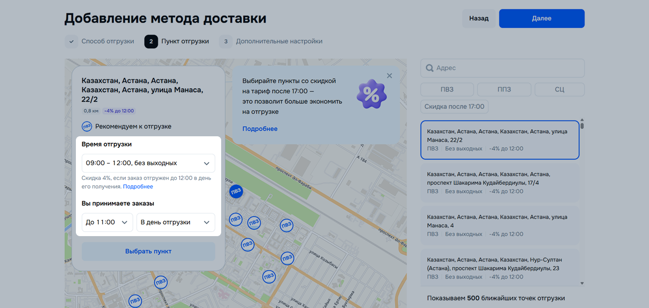 Время на сборку рассчитывается автоматически как разница между началом времени отгрузки и временем окончания приёма заказов. Вы можете настроить их при создании или редактировании метода доставки.