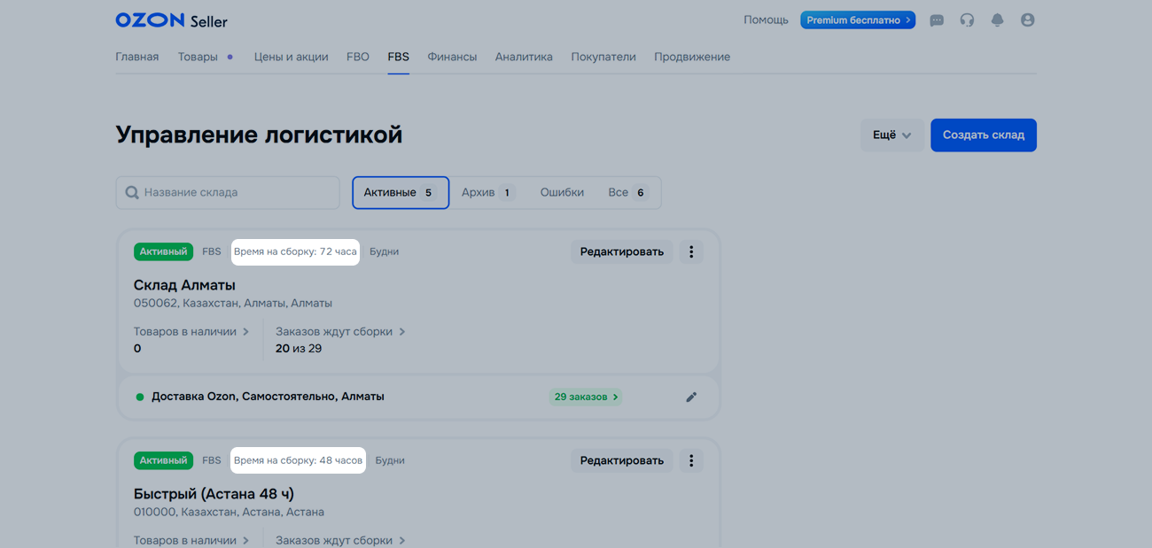Время на сборку для каждого склада можно посмотреть на карточке склада в разделе FBS → Управление логистикой.