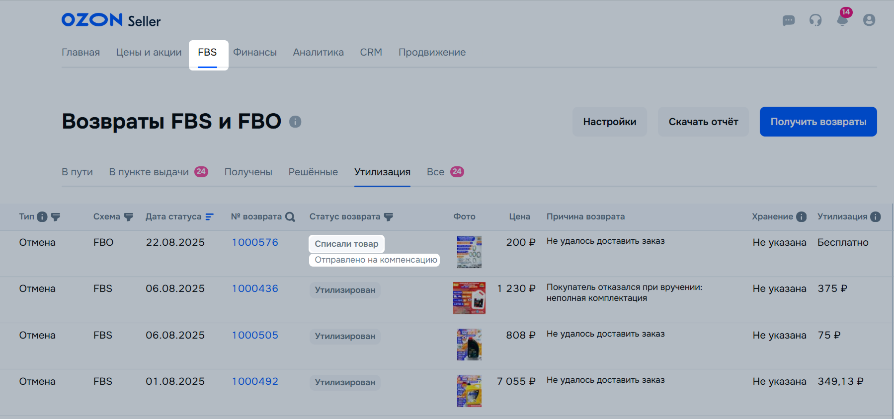 Вы можете посмотреть статус спорного возврата и компенсации по нему в разделе FBO → Возвраты FBS и FBO или FBS → Возвраты FBS и FBO, в столбце «Статус возврата».