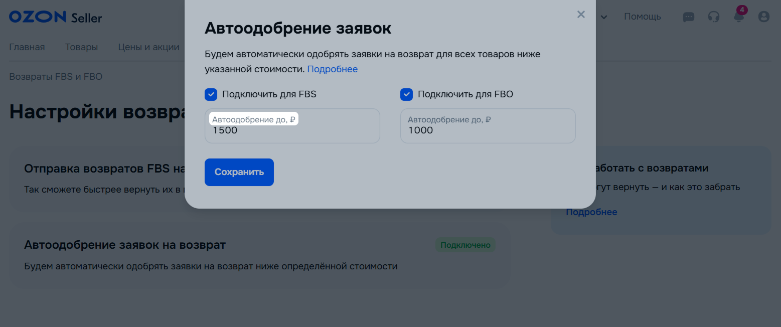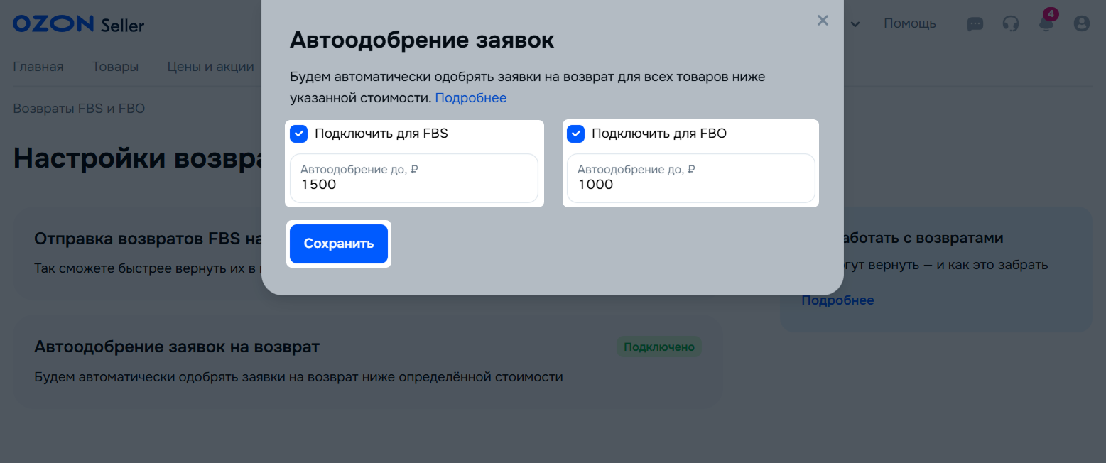 Если вы не хотите рассматривать заявки ниже определённой суммы, вы можете установить порог для премодерации на основе цены. Ozon будет автоматически одобрять такие заявки, возвращать вам товар, а покупателю — деньги.