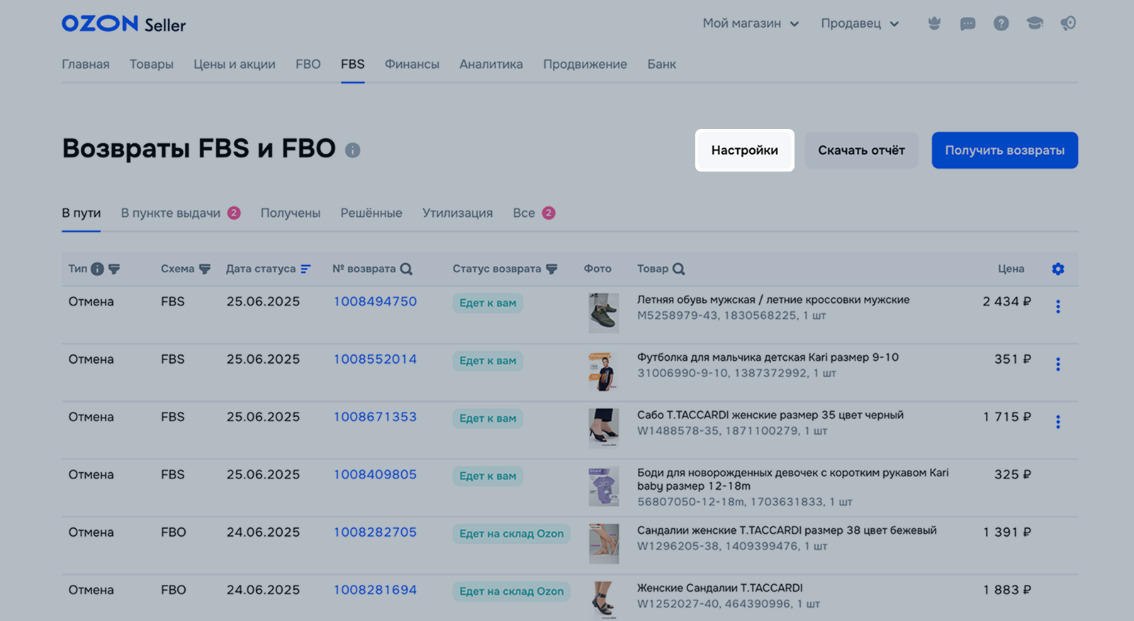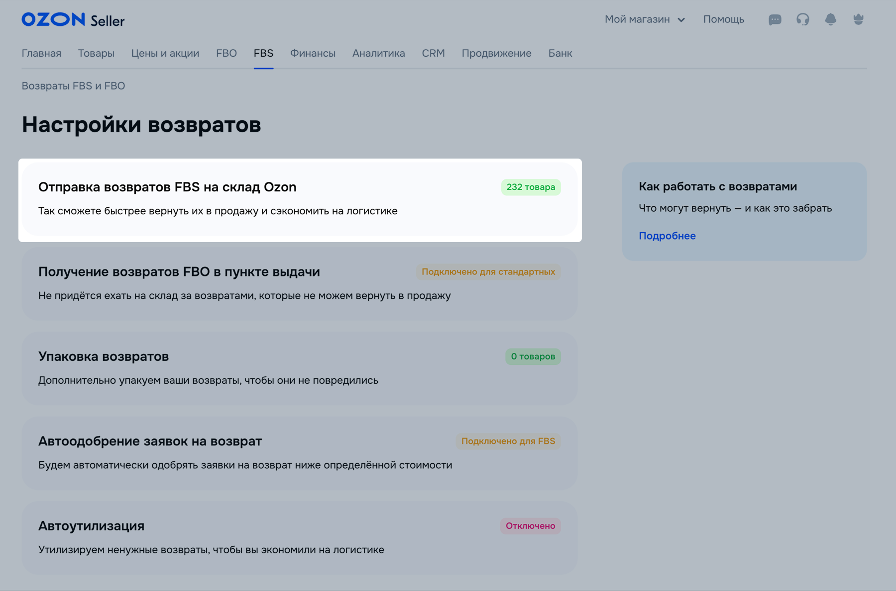 В разделе FBS → Возвраты FBS и FBO нажмите