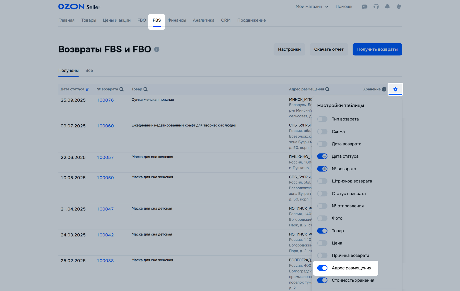 Чтобы узнать, куда отправится возврат, в разделе FBS → Возвраты FBS и FBO нажмите