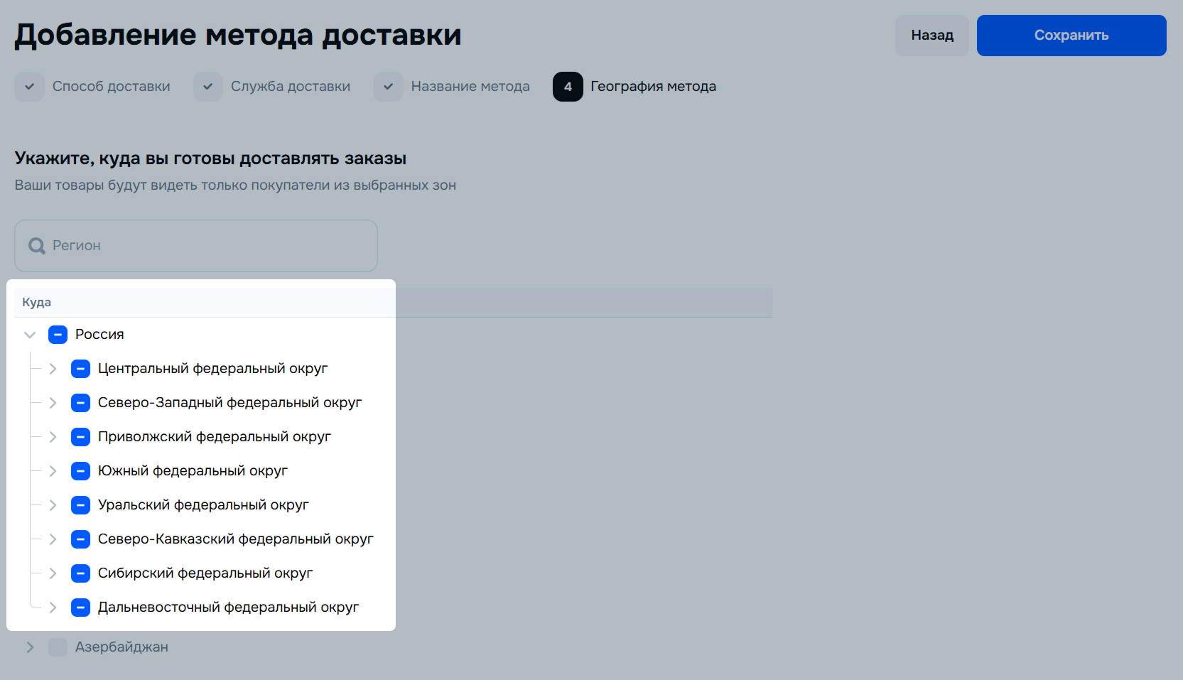 Настройте географию доставки. Вы можете посмотреть доступные регионы и выбрать субъекты, в которые вы готовы доставлять товары.