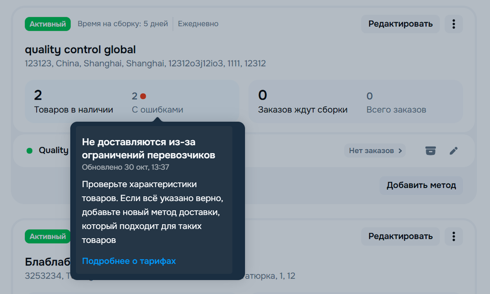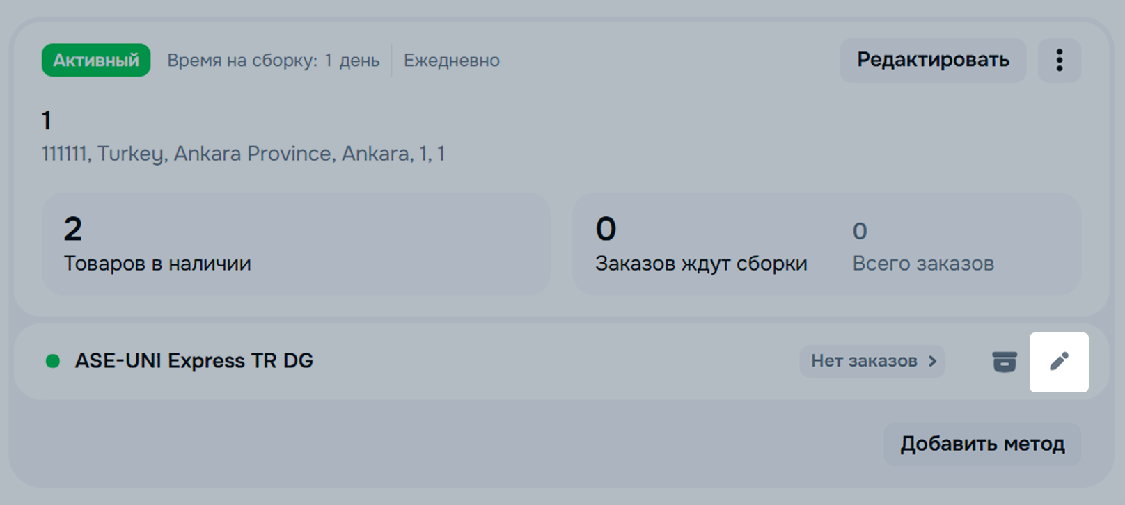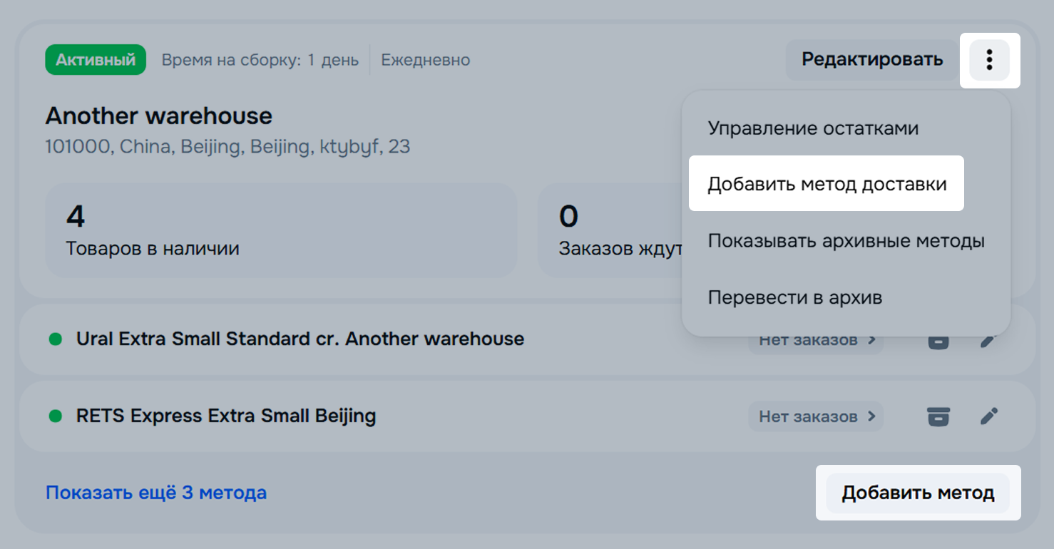 Если вы добавляете второй и последующие методы, на карточке нужного склада в блоке Методы доставки с этого склада нажмите Добавить метод или ⋮ → Добавить метод доставки. На одном складе может быть добавлено не более 100 методов.