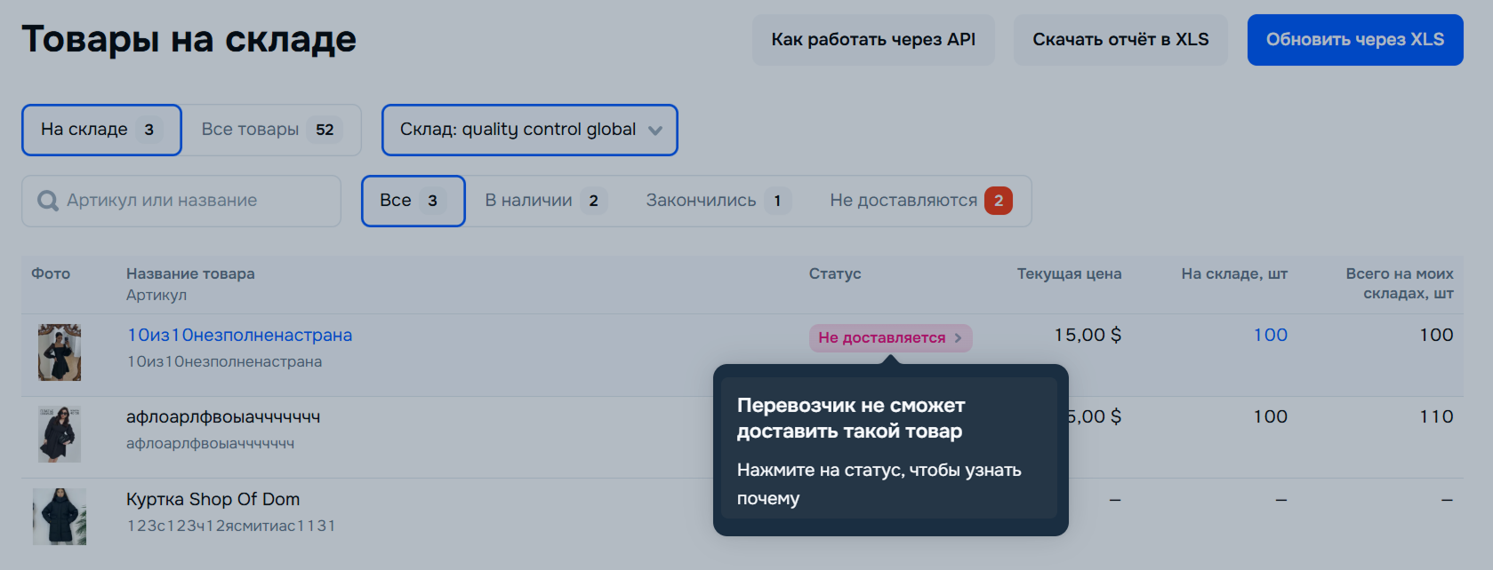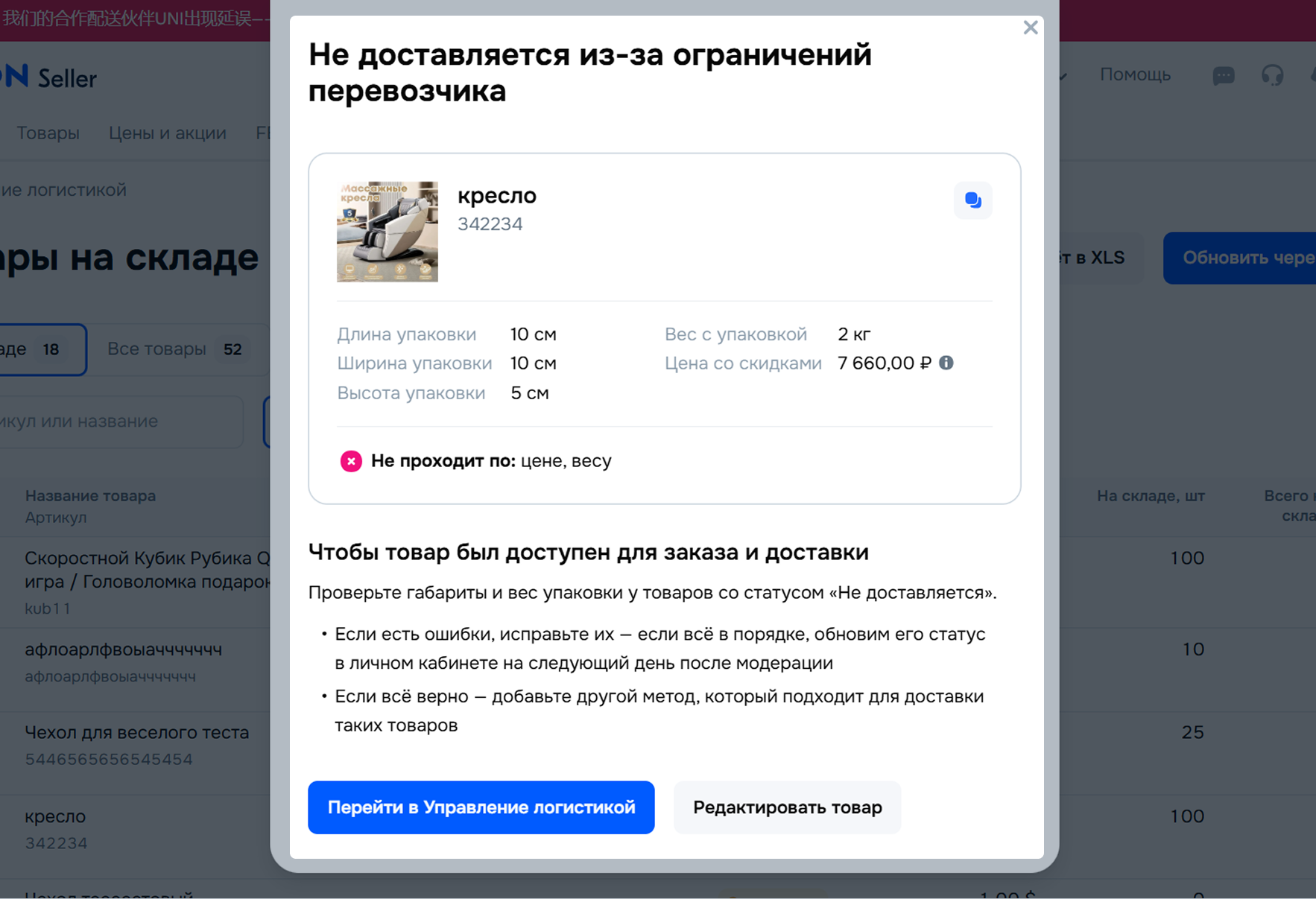 Чтобы посмотреть список недоступных товаров на складе, перейдите в раздел Логистика → Управление логистикой и нажмите на счётчик товаров.