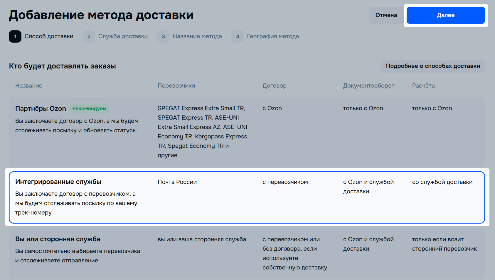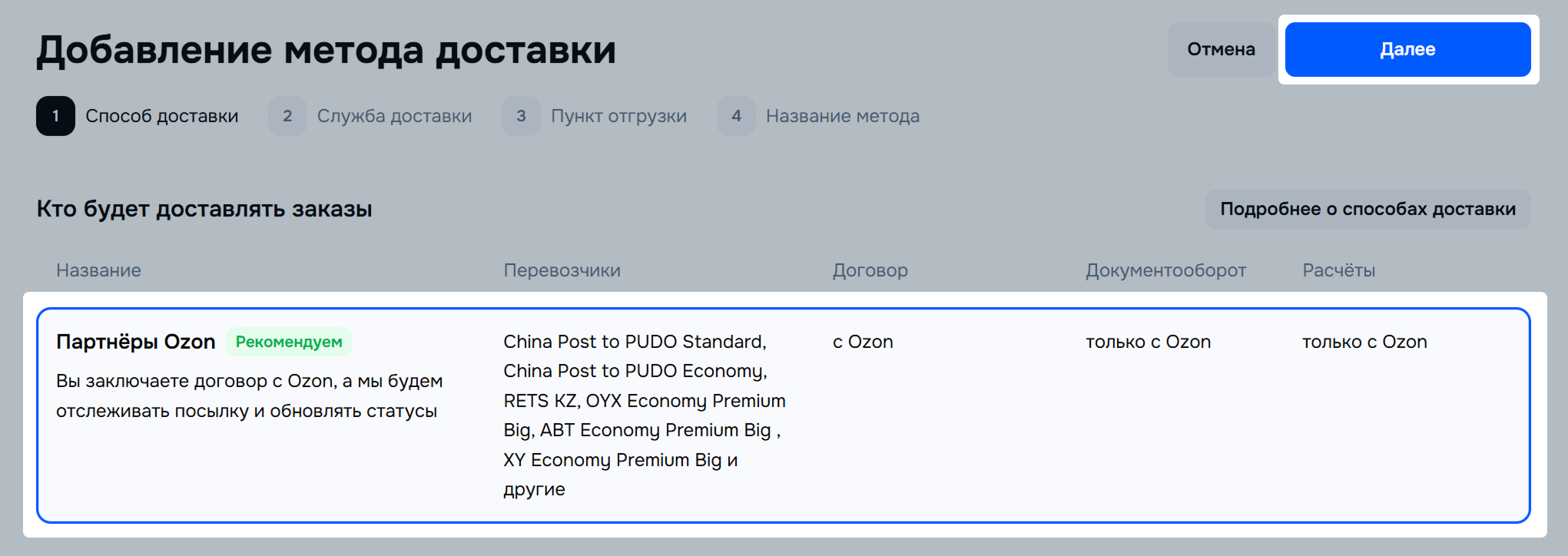 Выберите Партнёры Ozon и нажмите Далее. Методы доставки будут автоматически подобраны на основании адреса вашего склада.