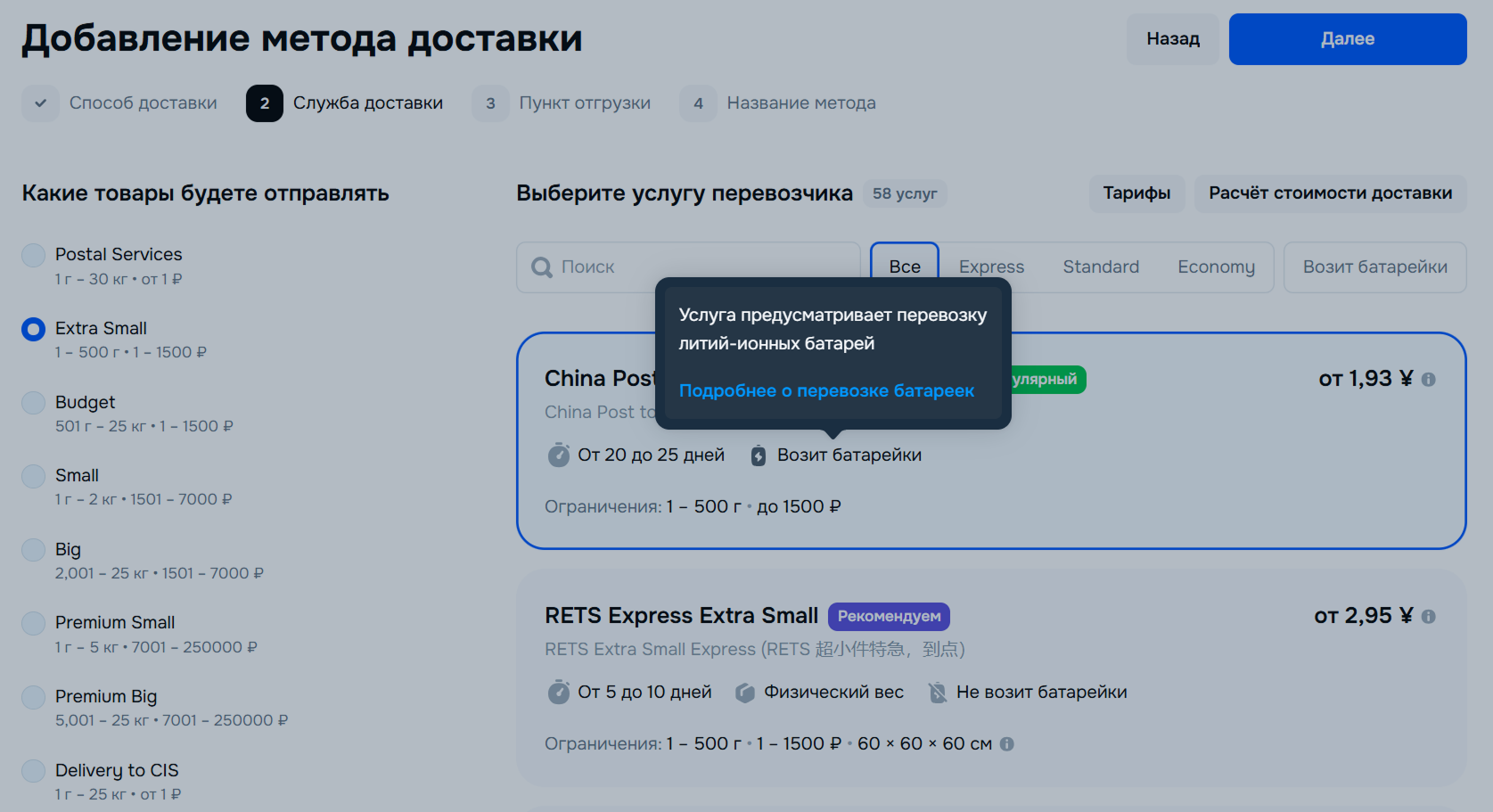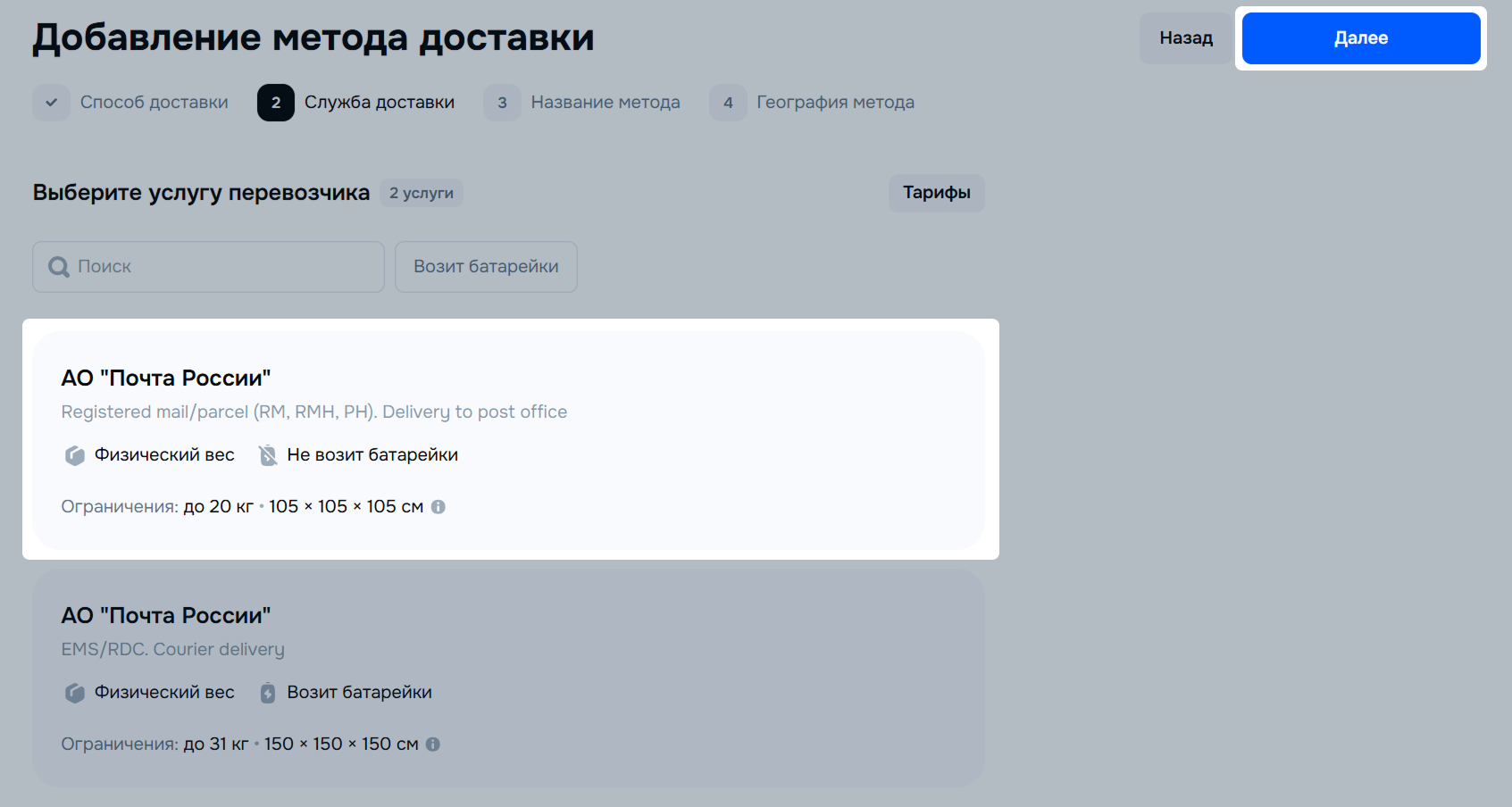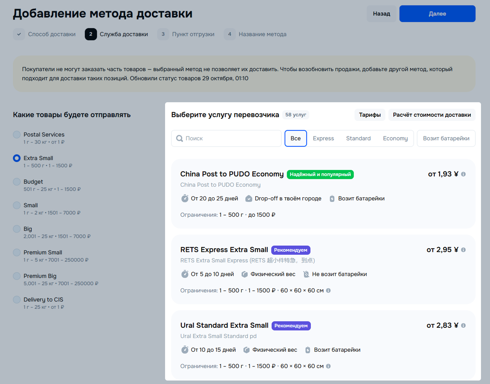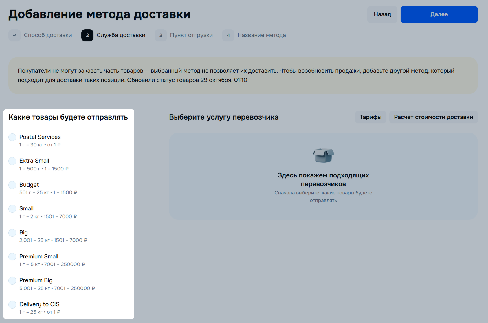 При выборе службы доставки учитывайте ОВХ товара в упаковке. У каждой службы доставки свои ограничения — если их не учесть и выбрать не тот метод, товары будут недоступны для заказа и доставки.