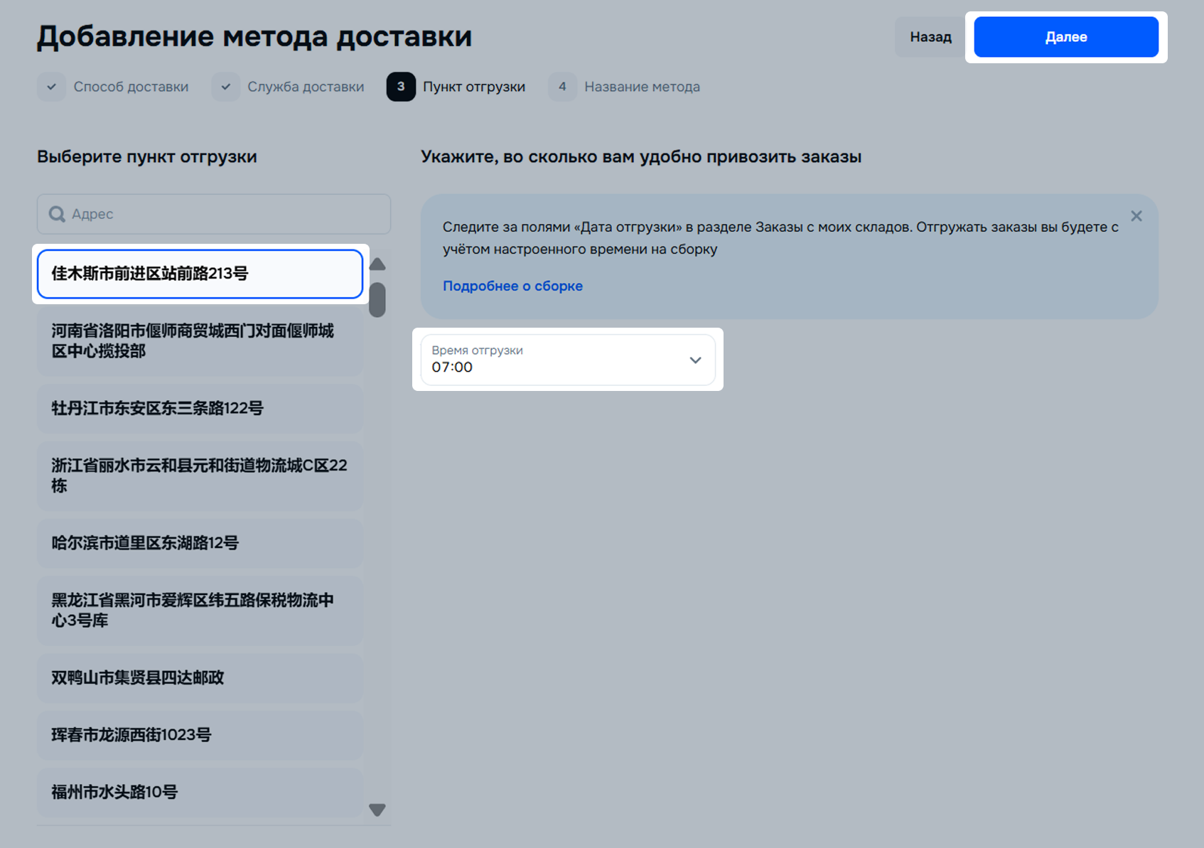 Выберите пункт отгрузки и укажите, во сколько вам удобно привозить заказы. Нажмите Далее.