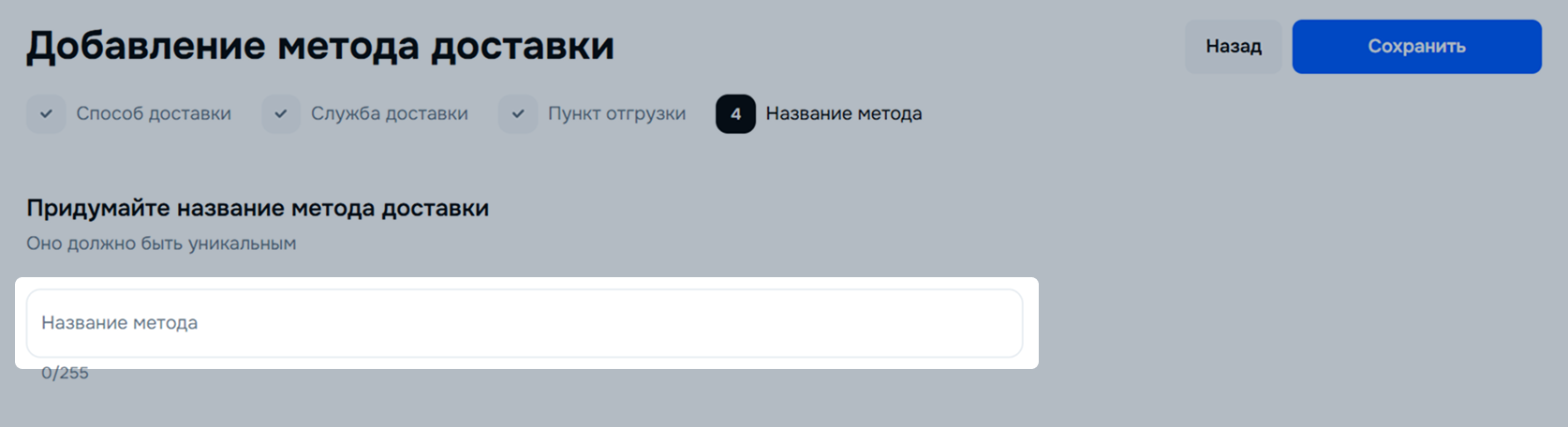 Оставьте автоматически сгенерированное название метода или придумайте своё. Допустимая длина — до 255 символов. Нажмите Далее.