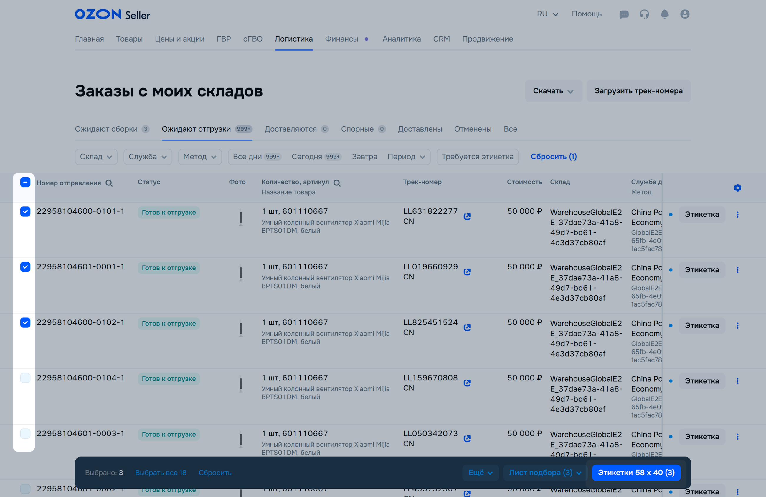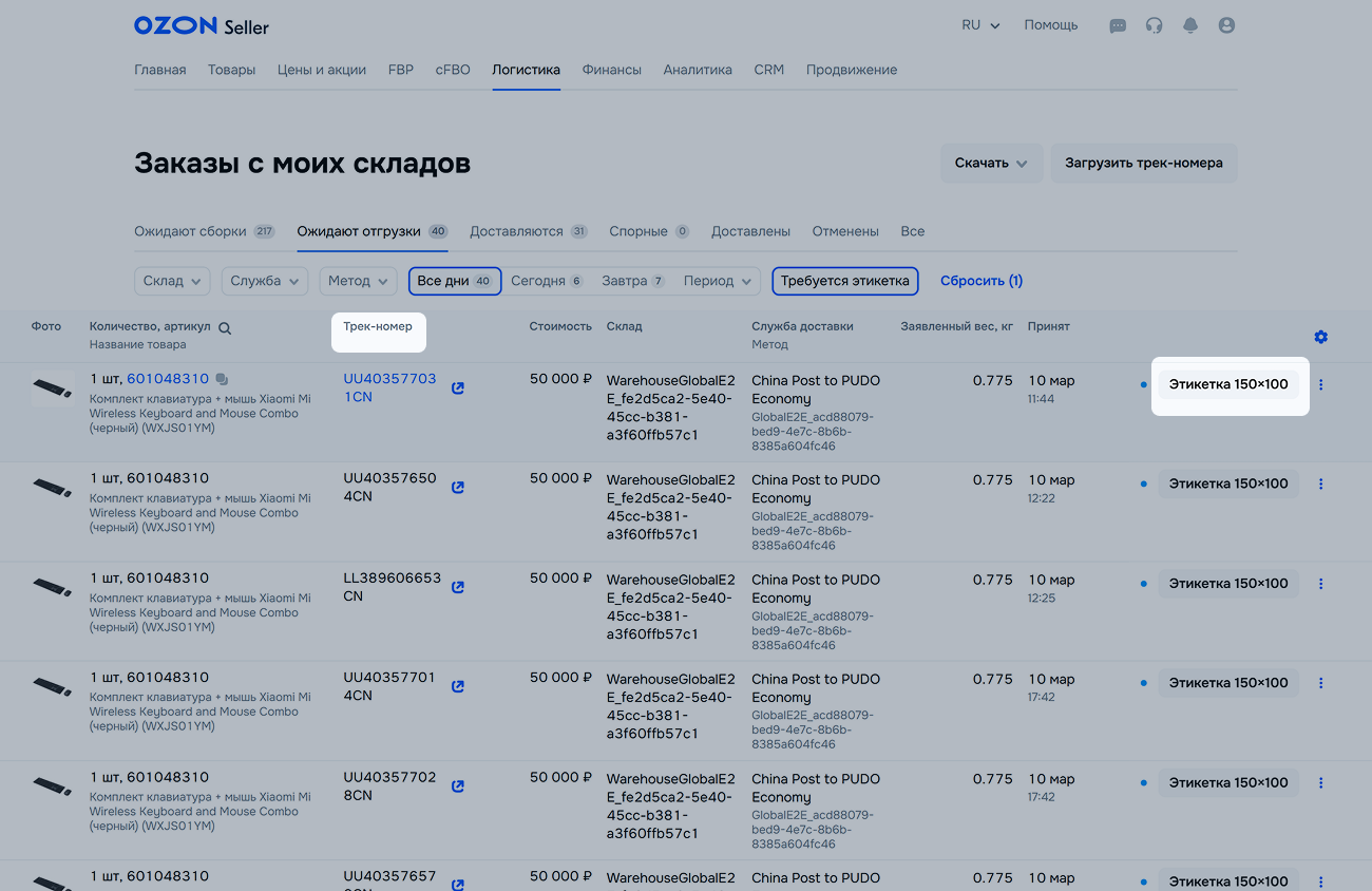 На следующих этапах всё контролирует Ozon, в том числе статусы, трек-номер, общение с покупателями и перевозчиками.