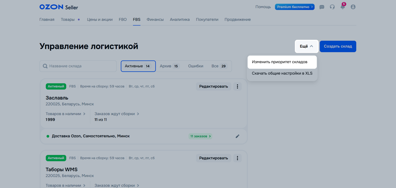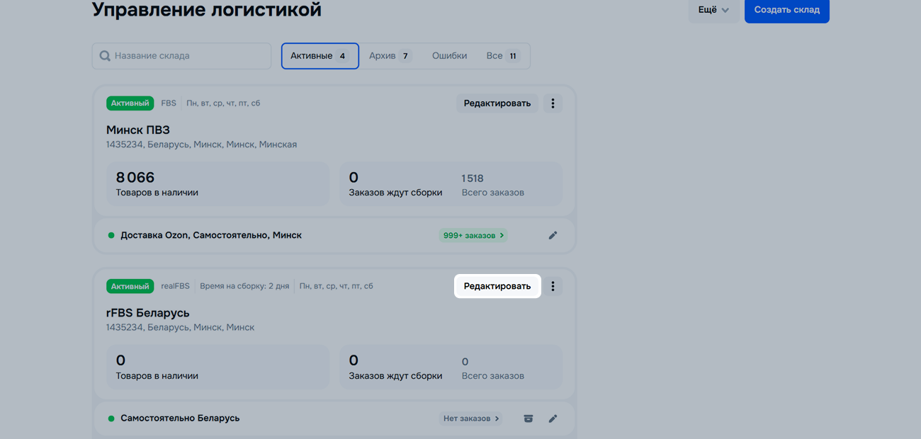 В одном личном кабинете вы можете создать суммарно не более 300 складов включительно для rFBS и FBP. Чтобы создать новый склад, при достижении лимита перенесите любой из существующих складов в архив.