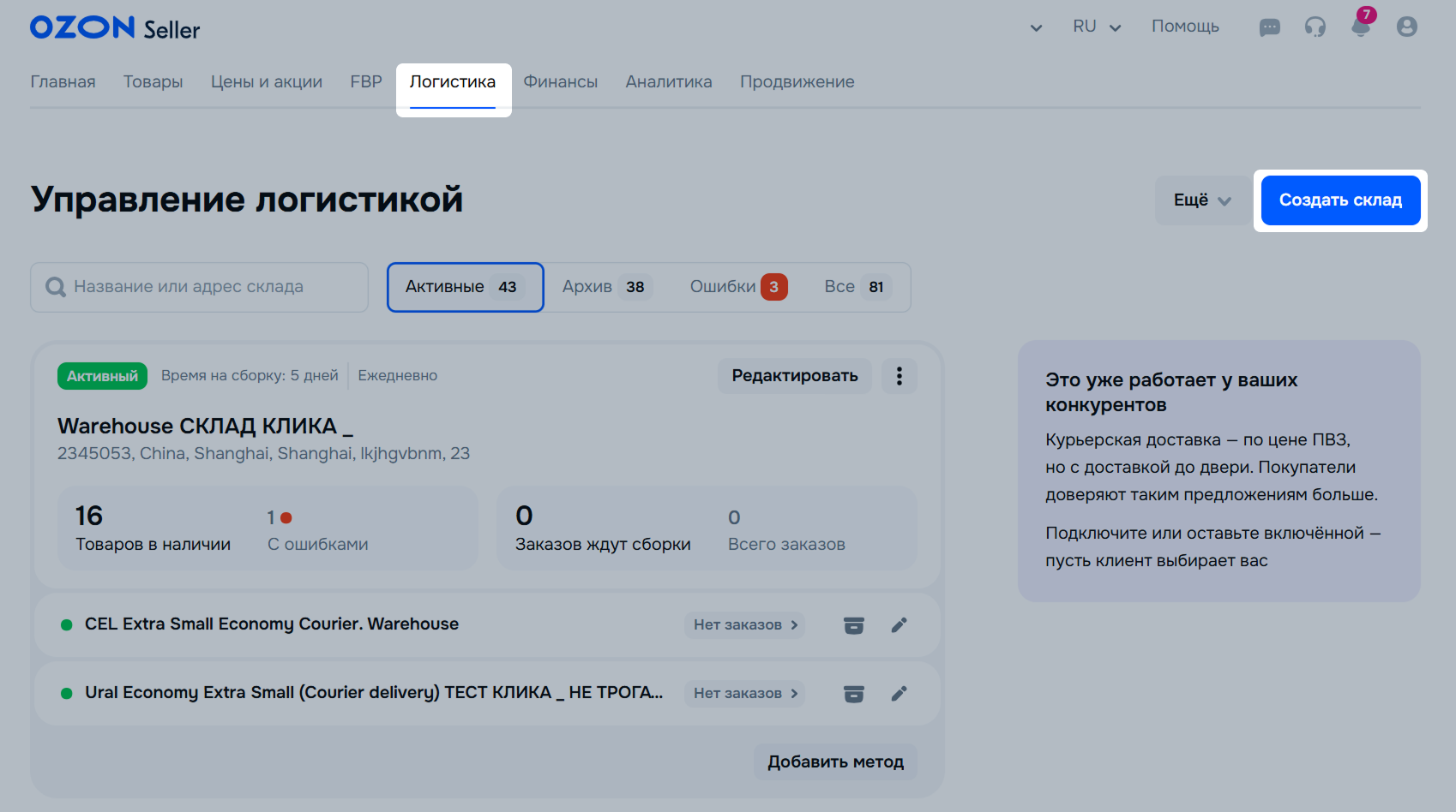 В личном кабинете перейдите на вкладку FBS → Управление логистикой или Логистика → Управление логистикой и нажмите Создать склад.