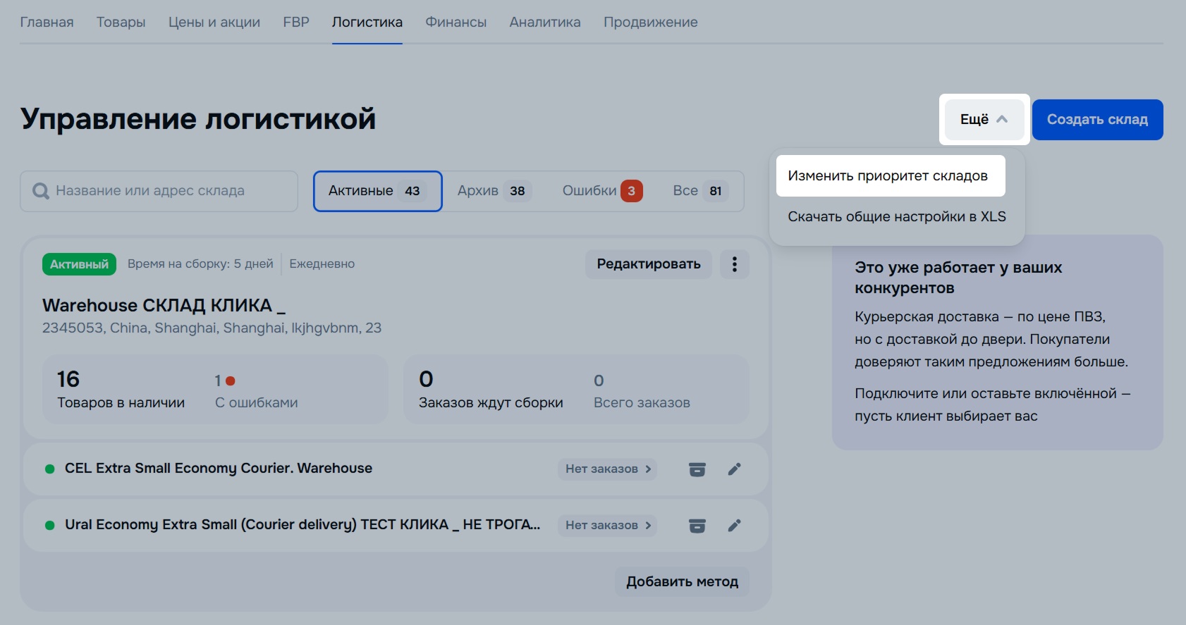 Если у вас несколько складов, с которых можно доставлять товары в одну страну или регион, настройте приоритет складов. Товары будут доставляться в первую очередь со складов с более высоким приоритетом.