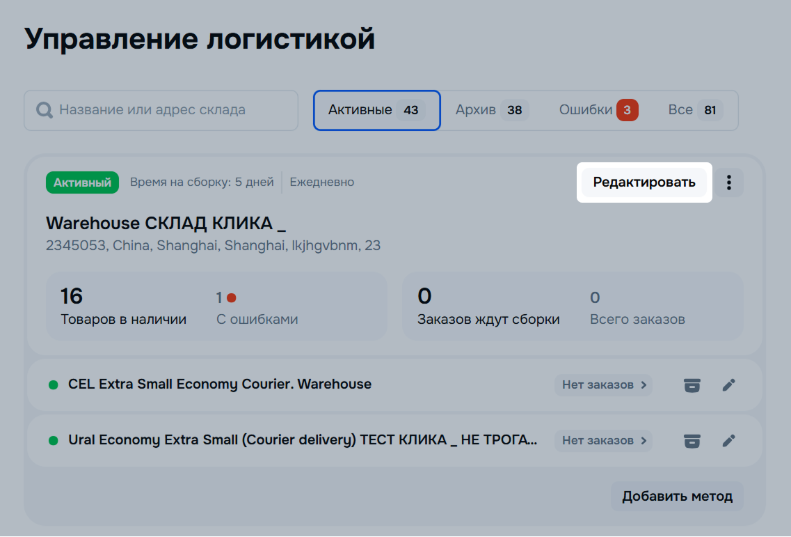 Внесите изменения, например отредактируйте время на сборку заказа. Объём изменений, которые вы сможете внести, зависит от того, добавлены ли методы доставки на этот склад.